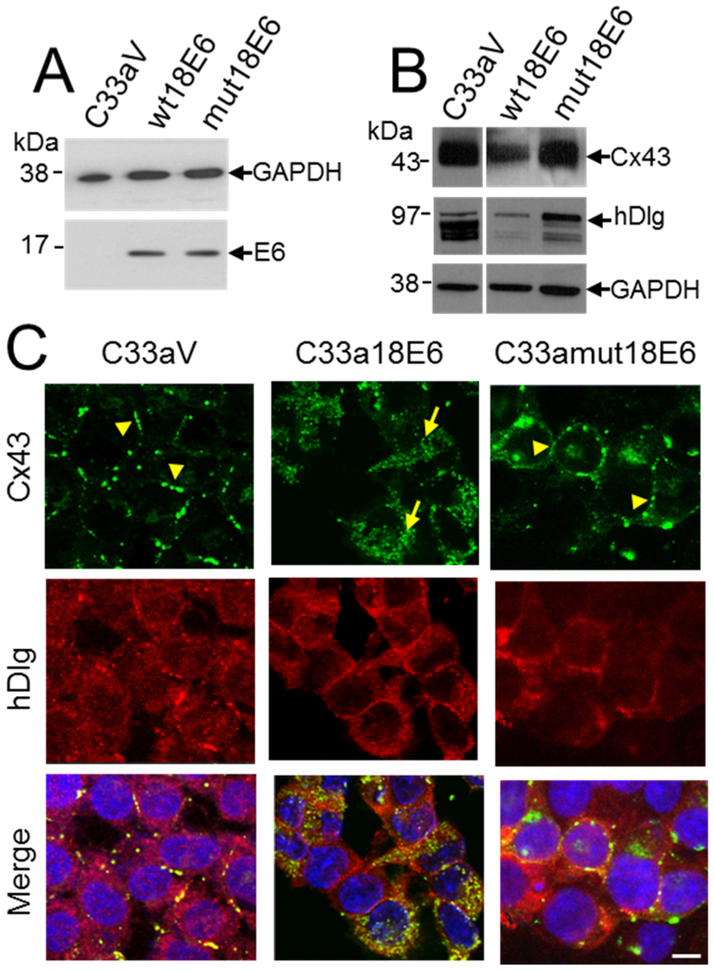 C33a cells expressing a mutant HPV18 E6 that cannot bind hDlg display membrane Cx43. (A) Western blot analysis of FLAG E6 expression in C33a cells stably transfected with vector alone (C33aV), vector expressing HPV18E6 (wt18E6) or a mutant HPV18 E6 that does not bind hDlg (mut18E6); (B) Western blot analysis of levels of Cx43 and hDlg in C33aV, C33a wt18E6 and C33a mut18E6. GAPDH is used as a loading control for the blots in (A,B); (C) Confocal immunofluorescence microscopy imaging of Cx43 (green) and hDlg (red) in C33aV cells, C33a18E6 cells and C33amut18E6 cells (cells expressing C-terminal mutated 18E6 that cannot bind hDlg). Membrane gap junction plaques are indicated with arrowheads. The arrow in B indicates cytoplasmic Cx43 staining. Nuclei are stained with DAPI. Bar = 10 µM.