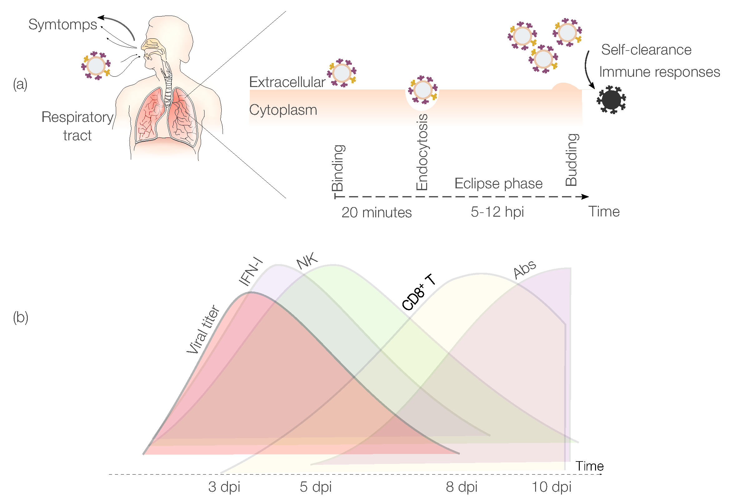Influenza A virus (IAV) infection and dynamics. (a) Description of the main phases of IAV infection within a host. After entering the respiratory tract, each virion binds to a target cell. Then, virions enter the eclipse phase (5–12 hpi), before starting to replicate and infecting other cells; (b) IAV and immune response (IR) dynamics. The innate IR is mainly represented by interferon (IFN)-I and by natural killer (NK) cells, whereas the adaptive IR is mainly driven by cytotoxic CD8 T cells (CTLs) and antibodies (Abs). Days post infection is abbreviated with dpi.