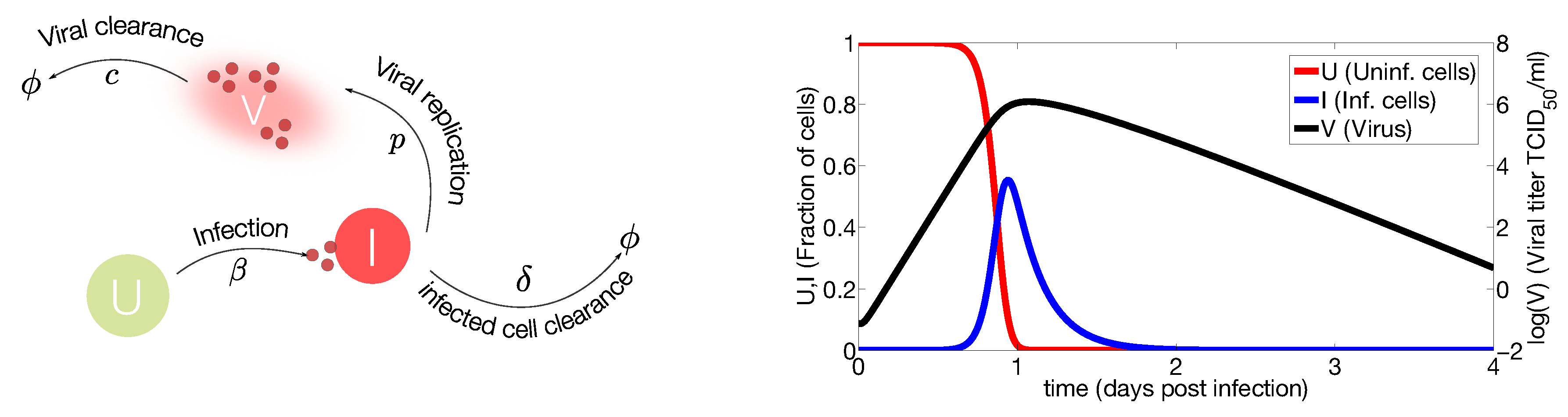 Target cell model. (Left) IAV (V) infects susceptible cells (U) with rate β. Infected cells are cleared with rate δ. Once cells are productively infected (I), they release virus at rate p and virus particles are cleared at rate c. The symbol ϕ represents clearance; (Right) Computational simulations of the target cell model. Parameter values used for model simulation are taken from [26]. The susceptible cells (red line) are rapidly infected while the virus (black line) and infected cells (blue line) peak at day one approximately. The viral growth is limited by the number of susceptible cells, decreasing the viral load and the number of infected cells to undetectable levels.