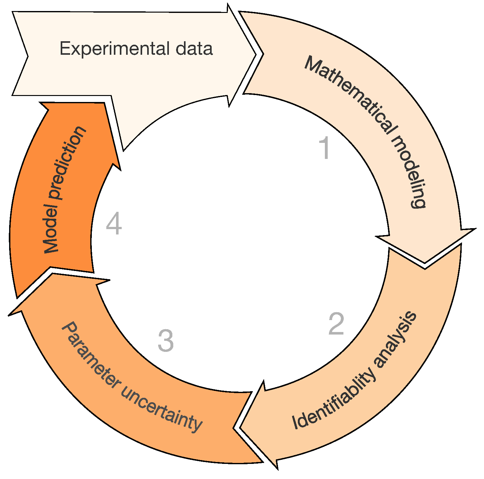 Mathematical modeling approach. From an experimental data set available, a mathematical model is developed/applied (step 1); Then, the identifiability analysis (step 2) should be carried out; Then, parameter uncertainty (step 3) is evaluated providing parameter confidence intervals. In this phase scatter plots can inform on the parameters relation and their influence on the mathematical model; Once reasonable parameter values are obtained, model prediction (step 4) can be performed generating new knowledge on the biological process and testing different scenarios.