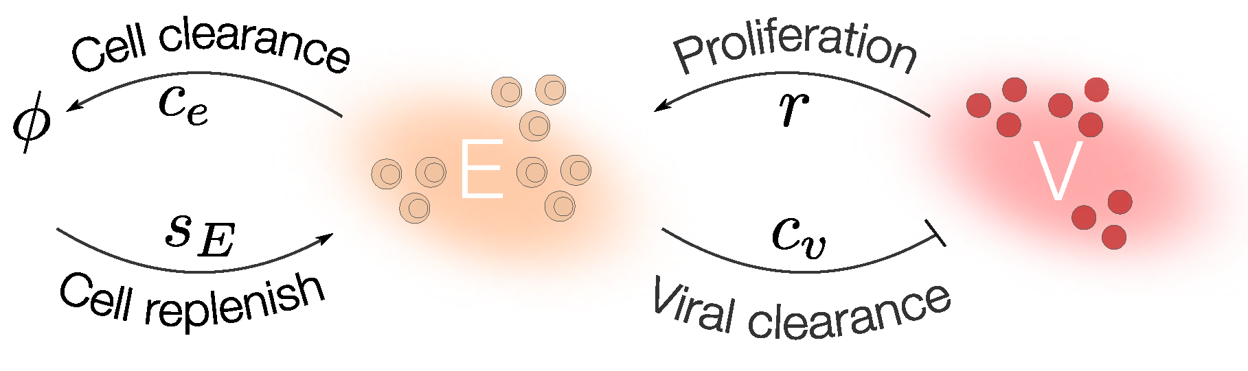 We consider a mathematical model assuming that IAV (V) replication induces the proliferation of CTLs (E). We assume that the clearance of the infected cells by CTLs can be represented by the clearance of the virus. The dynamics of V and E can be described by the following equations: