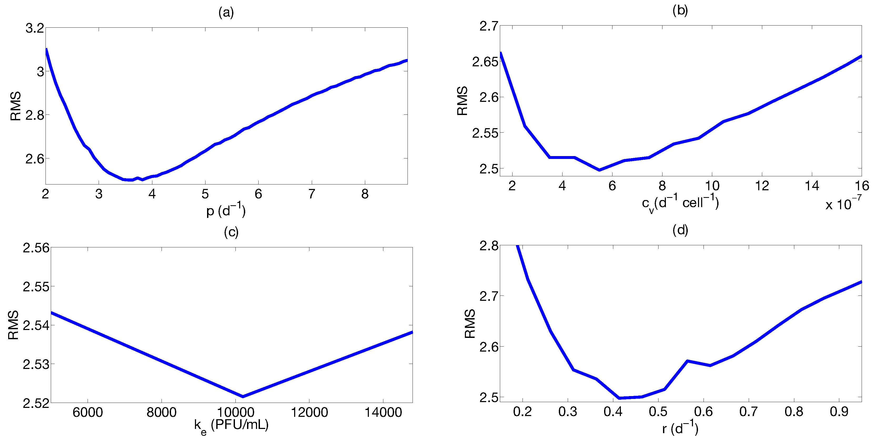Here, we consider the murine data from [81] to estimate the model parameters. In this cross-sectional study, young and aged BALB/c mice were infected with 50 μL (50–100 PFU) of the IAV (H1N1) (PR8) . Lung viral titers were measured at different time points by plaque assays. Various components of the IR were also monitored. In this section, the viral and CTLs time course from the young mice are considered. To reduce the number of parameters to be identified, we fix the value of (half life is approximately days) as reported by [82] and equal to the maximum value of the viral titer data in [81]. Therefore, the profile likelihood analysis can be computed on the unknown model parameters, this is shown in Figure 5. Note, that all the parameters present a profile likelihood with a minimum, implying that parameters are identifiable [72]. Therefore, the results suggest the possibility to infer model parameters from the available experimental data set.