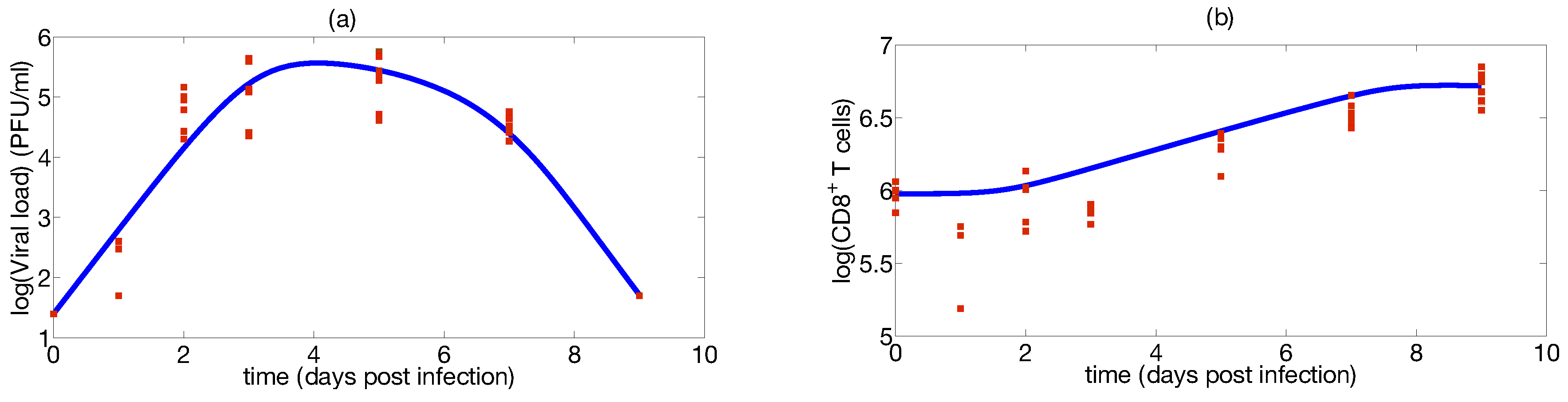 Viral infection model fitting: (a) The model fitting is shown with a blue line, viral load data is presented in red squares for mice infected with the IAV (H1N1) (PR8) strain; (b) the model fitting is shown in a blue line, the CTLs data is presented in red squares.