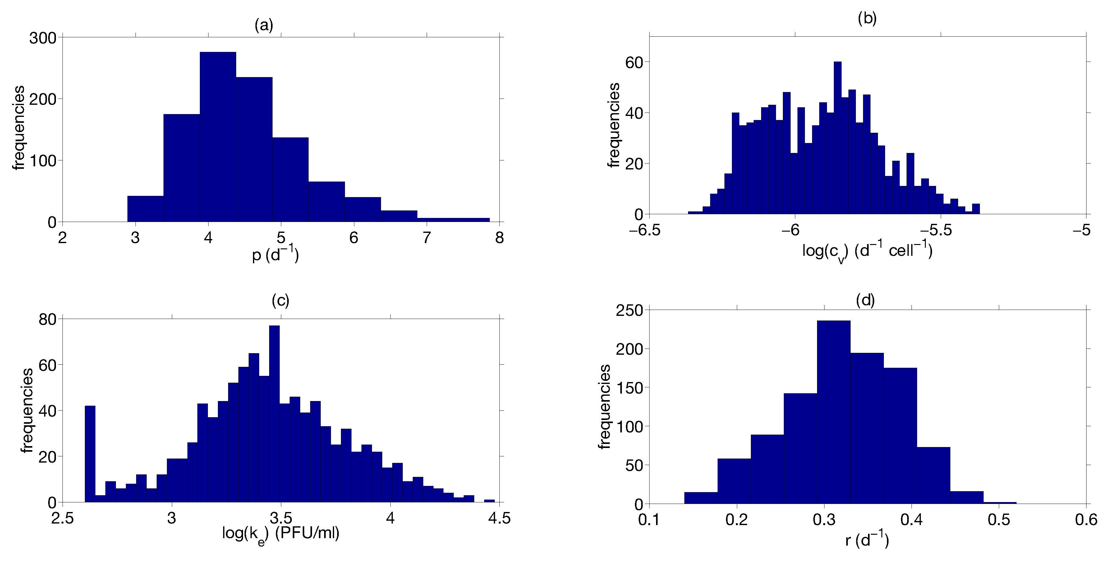 Identification of infection kinetic parameters is one of the fundamental tasks to advance the knowledge of IAV infection mechanisms. These may help and allow experimentalists to test different scenarios. Nevertheless, estimating properly the parameters is a big challenge when the data are limited. In [9], the authors reviewed the parameters of IAV kinetics from several studies and showed a large variation of IAV infection kinetics parameters, which is the result of different experimental settings (e.g., in vivo, in vitro), different hosts and IAV strains.