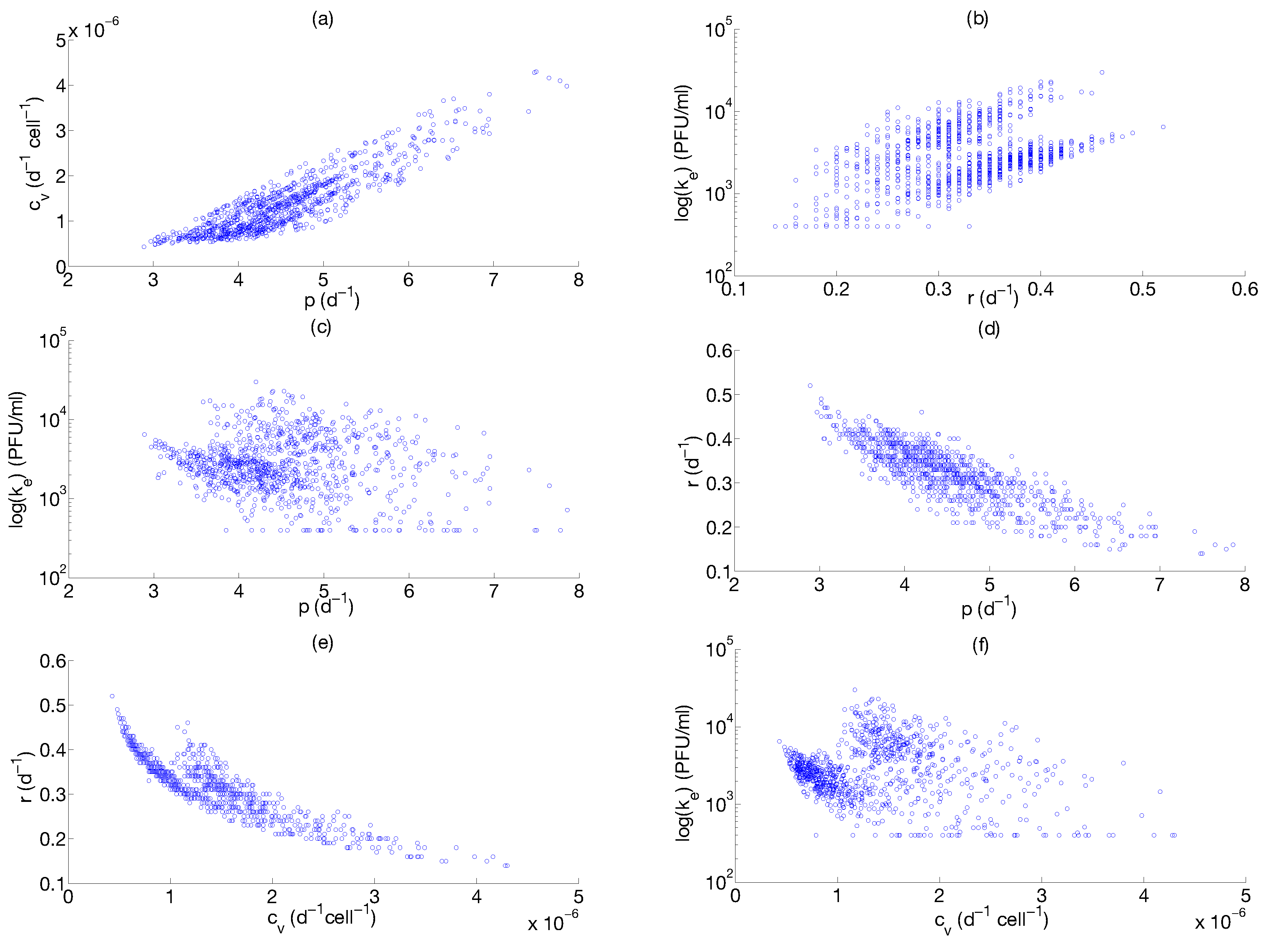 Scatter plot results. The scatter plots of (a) p-; (b) -r; (c) -p; (d) r-p; (e) r-, (f) -. The numerical values are obtained from the nonparametric bootstrap distributions in Figure 7. The plots show dependencies between parameters p-, p-r, -r.