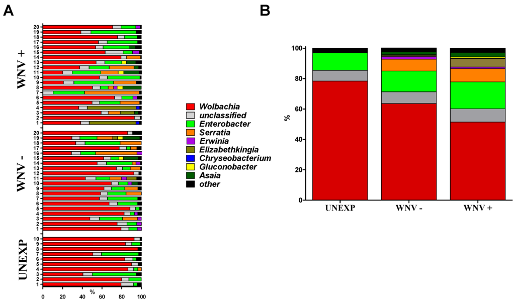 Proportions of bacterial genera identified in individual (A) or combined (B) Cx. pipiens at seven days post blood feeding. Mosquitoes are classified as unexposed (UNEXP, non-infectious blood meal), WNV negative (WNV−, WNV exposed but uninfected) or WNV positive (WNV+). Proportions were generated from 16S rRNA metagenomics workflow on MiSeq Reporter. “Other” refers to genera found at proportion below 3.5%.