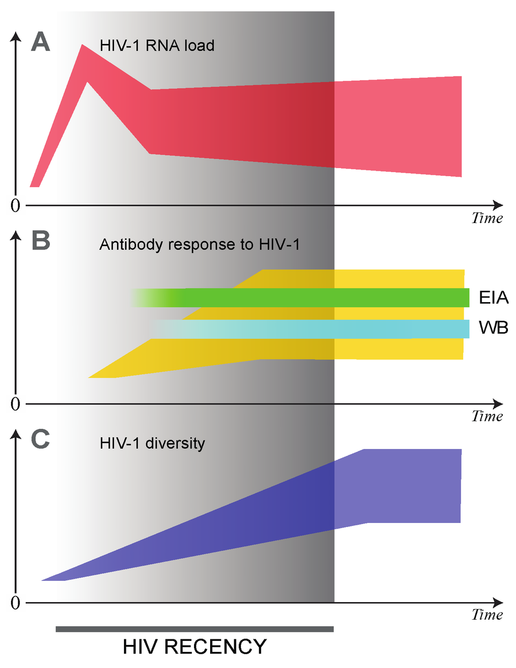 Markers of HIV recency: HIV-1 RNA load (A); antibody response to HIV-1 (B); and HIV-1 diversity (C). Heterogeneity of presented markers among HIV-infected individuals is highlighted by polygons (instead of single curves): red for HIV-1 RNA, yellow for cumulative anti-HIV antibodies, and blue for virus diversity. Time 0 indicates time of HIV transmission. The end of HIV recency period corresponds to approximately 12 months after HIV transmission. EIA: Enzyme immunoassay test for anti-HIV antibodies; WB: Western Blot.