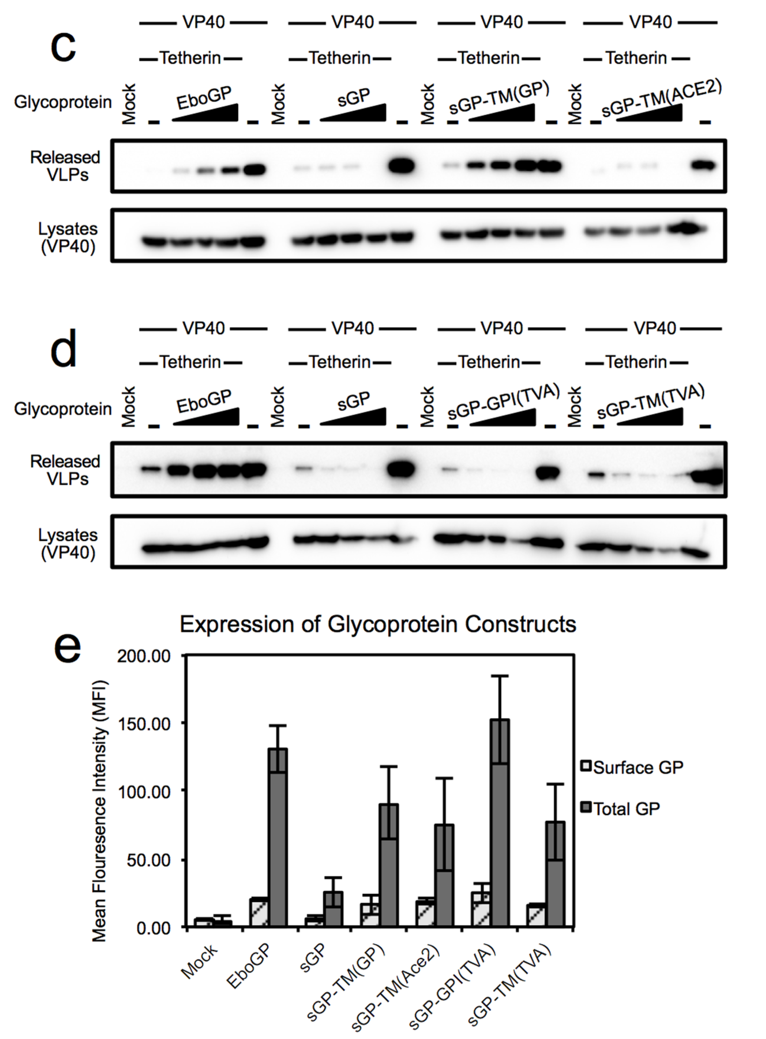 (a) A schematic diagram of the constructs used in this study showing the domains of EboGP, sGP, and a chimeric sGP with an appended membrane spanning domain (msd), either a protein transmembrane (TM) domain or a GPI anchor, to the C-terminus; (b) Amino acid sequences of the constructs employed, highlighting the C-terminal regions appended to the chimeric sGPs. Where known, the msd sequence is annotated; (c) An Ebola virus-like particle (VLP) budding assay comparing the anti-Tetherin activity of EboGP, sGP and chimeric sGPs. 293T cells were transfected with plasmids encoding VP40-FLAG, human Tetherin and varying amounts of the GP constructs as indicated. Top Panel: Purified VLPs were analyzed by SDS-PAGE and immunoblot using a FLAG-tag antibody to detect VLPs released into the media. Bottom Panel: Cell lysates were analyzed by SDS-PAGE and immunoblot probed with an antibody to FLAG to evaluate VP40 expression in the transfected cells; (d) A VLP budding assay comparing the anti-Tetherin activity of EboGP, sGP, and sGP with either a GPI anchor or a proteinaceous msd from TVA. Top Panel: Purified VLPs were analyzed by SDS-PAGE and detected by immunoblot and probed with an antibody to the FLAG tag of VP40. Bottom Panel: VP40 expression in the 293T cell lysates was confirmed by using an antibody to FLAG in the immunoblot. Results are representative of at least 3 independent experiments; (e) A bar chart depicting the relative expression of the GP constructs in 293T cells, as measured by flow cytometry, after staining with a polyclonal antibody (R12) to GP. Surface GP was detected on fixed cells without permeabilization, while for total GP, staining was performed after permeabilization.