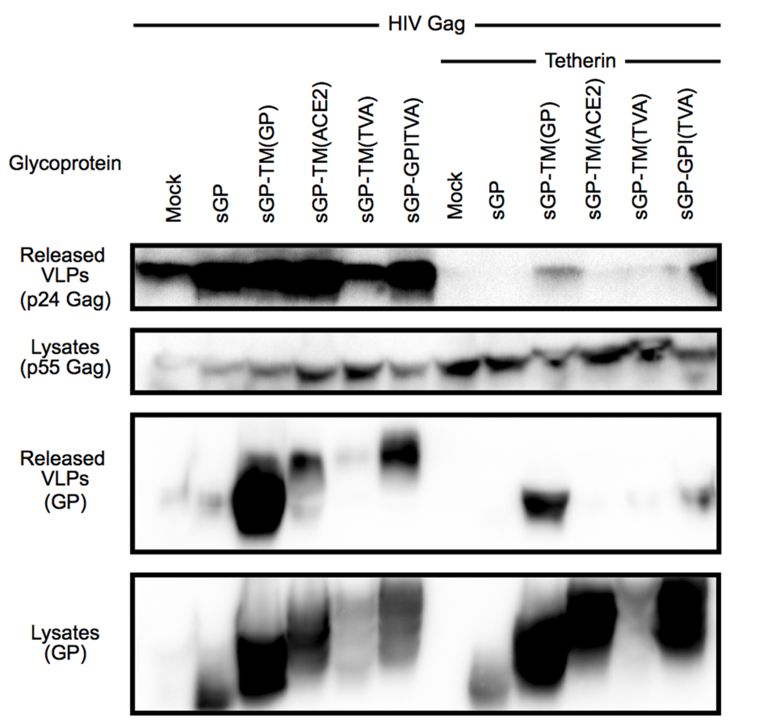 To address whether the requirement for the EboGP msd is specific for budding of Ebola VP40 or if the EboGP msd is able to promote release of other viral particles that are restricted by Tetherin, we tested several of the EboGP chimeras for their effect upon HIV-1 VLP budding in the presence of human tetherin. Similar to the results with VP40, the sGP-TM(GP) chimera allowed budding of HIV particles from tetherin expressing cells (Figure 2, top panel). As was the case for filamentous Ebola VP40 particles, neither the ACE2 or TVA heterologous membrane spanning regions, nor the TVA GPI anchor could substitute for the msd of EboGP to promote efficient HIV-1 budding (Figure 2, top panel). Although the sGP-TM(TVA) chimera was poorly expressed in these experiments, which might account for its inability to counteract tetherin, both sGP-TM(ACE2) and sGP-GPI(TVA) were well expressed (Figure 2, fourth panel) yet unable to promote HIV-1 particle budding.