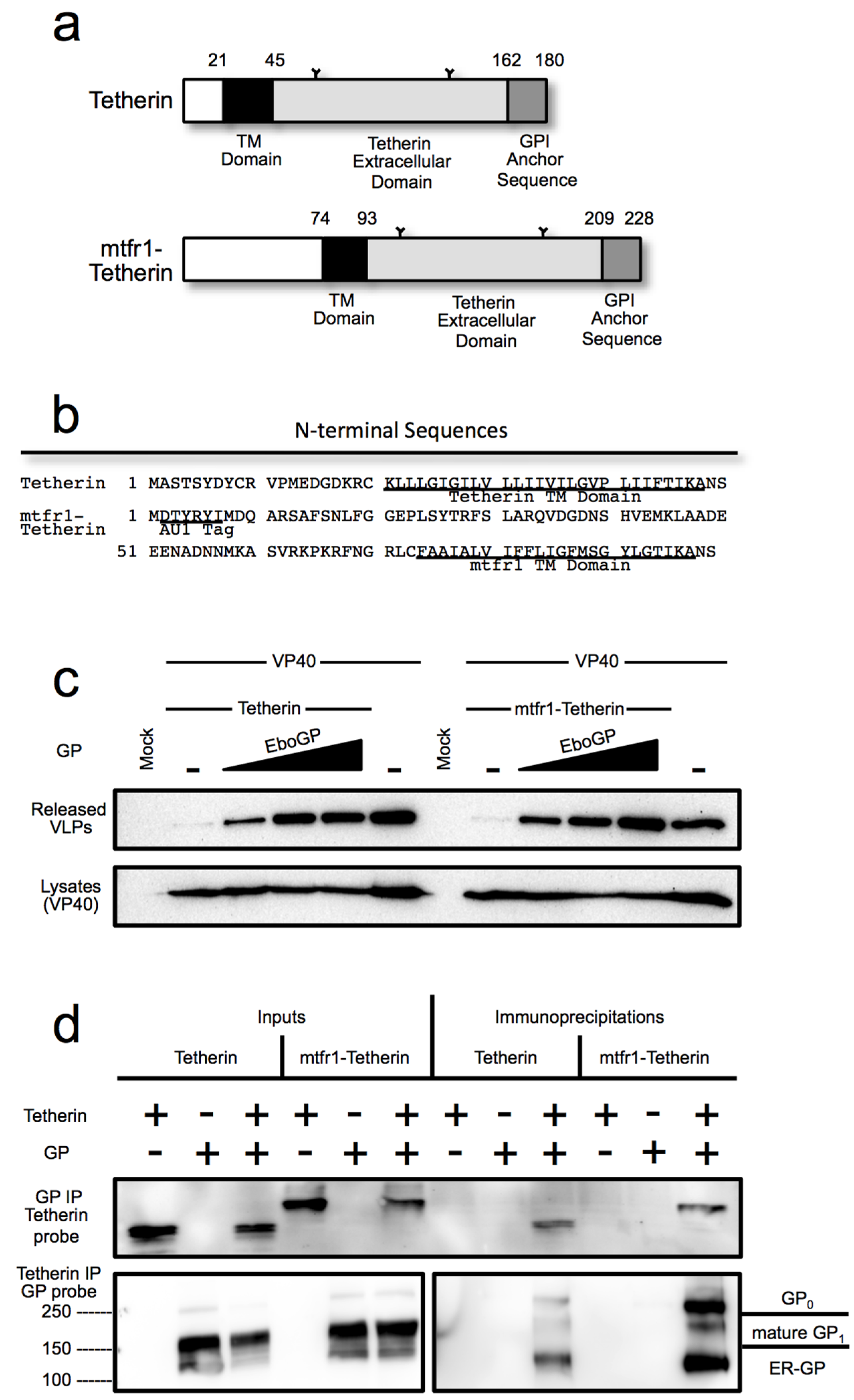 (a) Schematic diagram of human tetherin and the chimeric mtfr1-tetherin containing a cytoplasmic tail and transmembrane domain from mouse transferrin receptor 1 (mtfr1); (b) A comparison of the N-terminal amino acid sequence of tetherin and mtfr1-tetherin; (c) A budding assay comparing the ability of the Ebola virus glycoprotein to release VLPs retained by tetherin or mtfr1-tetherin. 293T cells were transfected with VP40-FLAG and increasing amounts of EboGP with either human tetherin or chimeric mtfr-tetherin as indicated. Top Panel: Purified VLPs were analyzed by SDS-PAGE/immunoblot using an anti-FLAG antibody for detection. Bottom Panel: 293T cell lysates were analyzed by SDS_PAGE/immunoblot, and probed with the anti-FLAG antibody to confirm VP40 expression; (d) Co-immunoprecipitation analysis comparing the ability of tetherin and mtfr1-tetherin to interact with EboGP. Lysates from 293T cells expressing tetherin and/or EboGP were analyzed by SDS-PAGE/immunoblot either directly (Inputs) or after immunoprecipitation with antibody specific for GP (top panel) or tetherin (bottom panel). Molecular mass is shown to the left in kD. The major forms of EboGP are indicated to the right. The left middle panel is a lower exposure of the right middle panel to visualize the overexposed lanes.