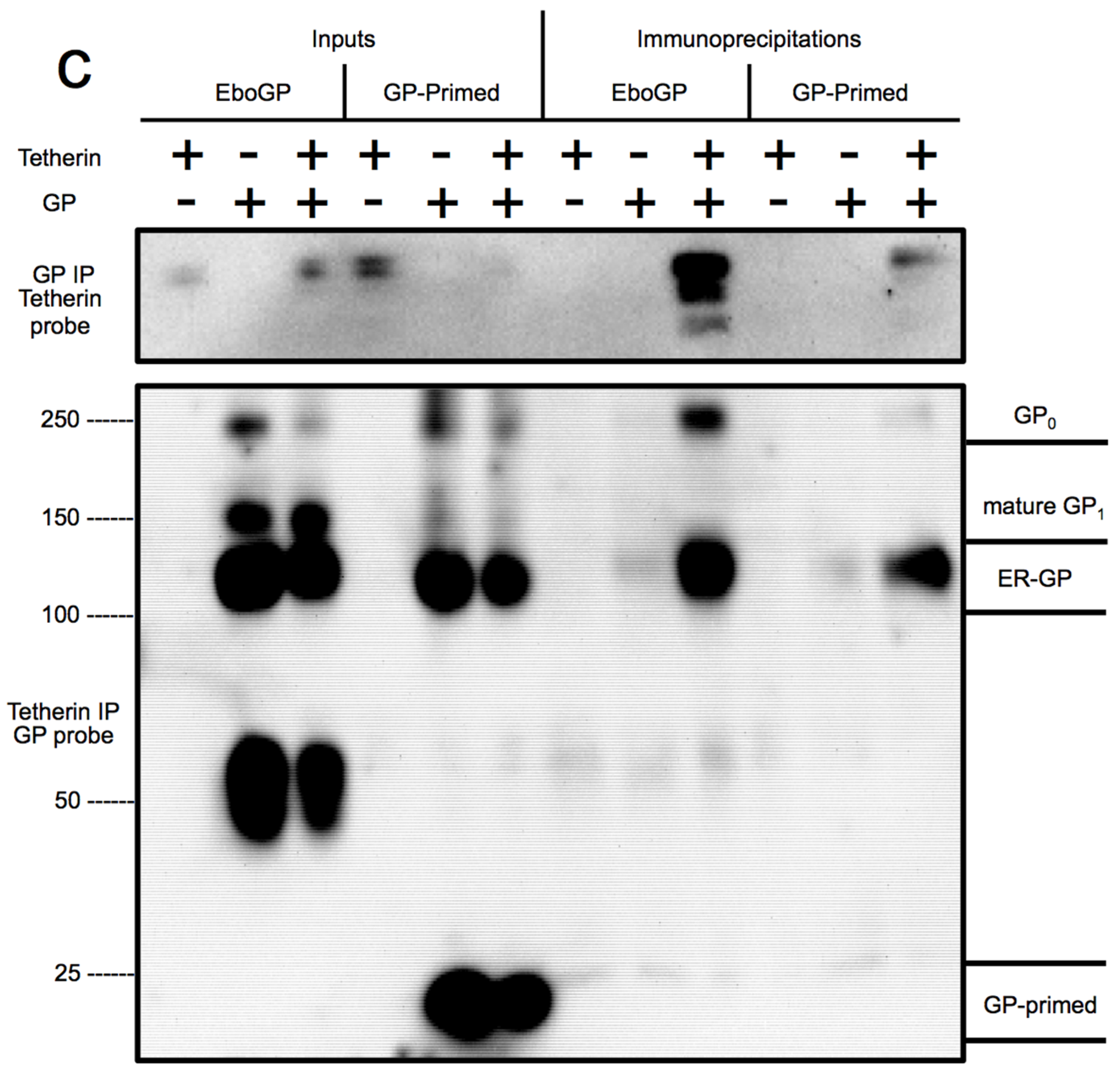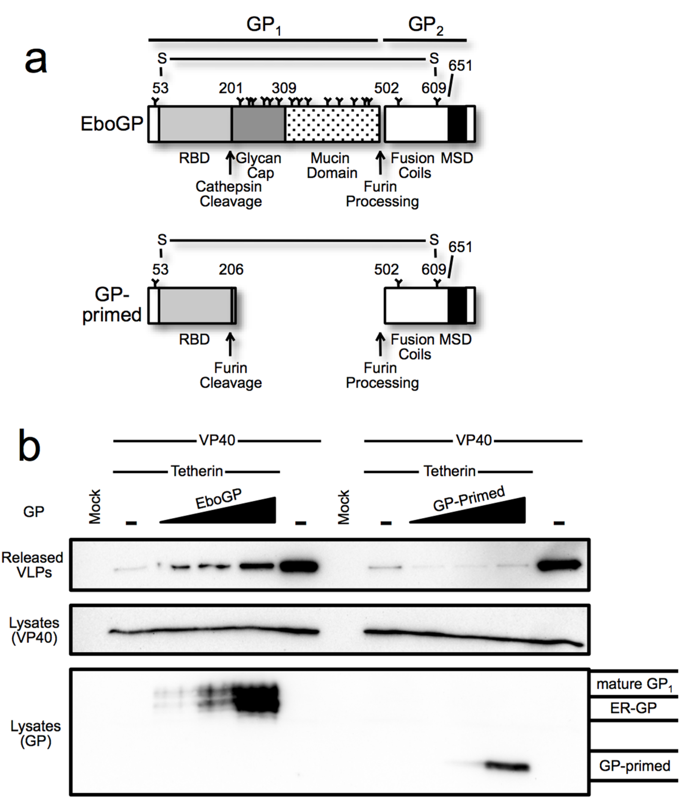 (a) Schematic diagram depicting the domains of EboGP and GP-primed, a construct that mimics the glycoprotein produced during Ebola virus entry by introduction of a furin cleavage site at the position where cathepsin processing normally occurs; (b) Ebola VLP budding assay comparing GP-primed to EboGP. Top Panel: Purified supernatants of 293T cells transfected with the indicated expression plasmids were analyzed by SDS-PAGE and probed with anti-FLAG antibody to detect FLAG tagged VP40. Middle Panel: 293T cells producing the VLPs were lysed in TritonX-100 buffer, analyzed by SDS-PAGE and immunoblot using α-FLAG antibody. Bottom Panel: The blot from the middle panel was stripped and re-probed with polyclonal antibody against GP to detect the differential forms of the filovirus glycoproteins; (c) EboGP and GP-primed interactions with tetherin. Analysis of cell lysates (input) or immunoprecipitated proteins from 293T cells transfected with tetherin and EboGP or GP-primed as indicated. Top Panel: Precipitation using polyclonal α-EboGP sera flowed by SDS-PAGE and detection with an α-tetherin monoclonal antibody. Bottom Panel: A reciprocal analysis, using an α-tetherin antibody for immunoprecipitation and detection with α-EboGP sera. Molecular mass is shown in kD. Indicated on the right are the immature (ER) form of the Ebola virus glycoprotein, GP0 and the mature forms of GP-primed and EboGP.