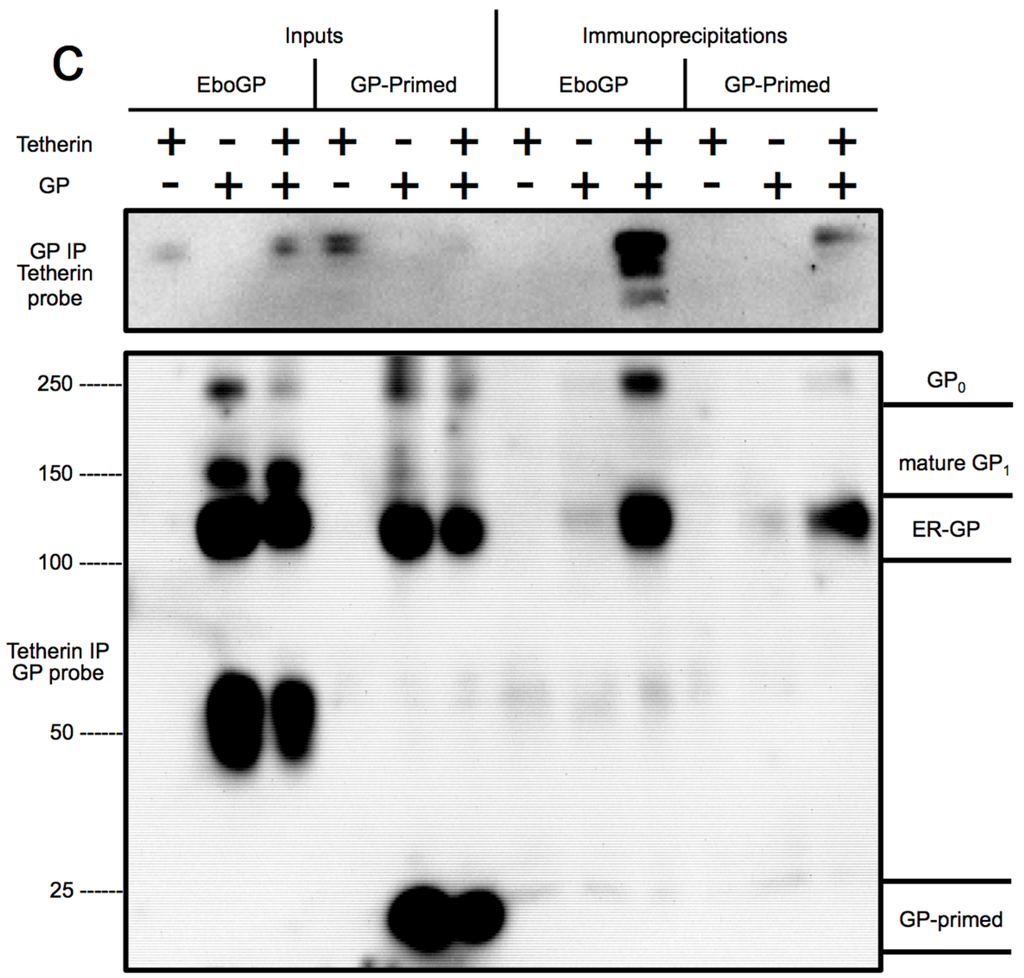 To ascertain whether the glycan cap domain participates in the EboGP–tetherin interaction, we compared the ability of EboGP and GP-primed to immunoprecipitate tetherin. EboGP and tetherin were co-expressed in 293T cells and the interaction was assessed by co-IP with antibodies to EboGP. The interaction was also verified by performing the reciprocal IP. Both the inputs and immunoprecipitated protein were analyzed by Western blot (Figure 4c). We were able to confirm the EboGP-tetherin interaction, as shown in previous work [2]. Surprisingly, in contrast to the VLP release data, IP of cells expressing GP-primed effectively co-precipitated tetherin. However, an IP with a tetherin antibody precipitated only pre-processed immature GP and not the cleaved form lacking the glycan cap or the mature full-length glycoprotein. Thus, while the glycan cap seems to be important for the anti-tetherin activity of EboGP, it remains unclear whether or not the glycan cap has a role in mediating the tetherin interaction.