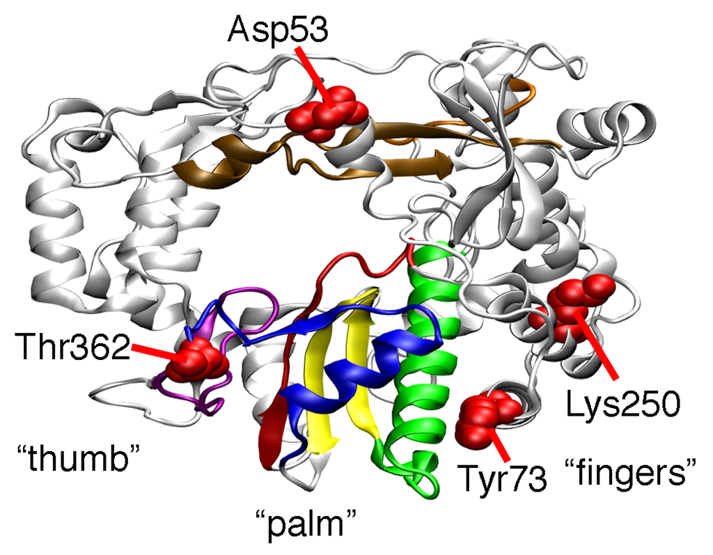 Other amino acid substitutions in the Sabin I RdRp may also change RdRp function. The Y73H substitution has been shown to interfere with the initiation of RNA synthesis [19], which might help to explain why PV encoding the Y73H substitution is attenuated [17,20]. The D53N, Y73H, and T362I substitutions also contribute to the temperature sensitivity of the Sabin I vaccine [15,16,17,31]. The Sabin substitutions may also affect each other. Our previous molecular dynamics (MD) simulations suggest that the T362I amino acid substitution induces different nanosecond timescale motions in distant parts of the enzyme, including around Asp53 [22]. We have also previously noted anti-correlated motions between motif D and the α-helix containing Tyr73 [32]. It is also noted that the helices containing Tyr73 and Lys250 are packed closely together (Figure 1). Altogether, these results suggest that there are structural and dynamic connections between the various Sabin sites, which may contribute to the function of the Sabin I RdRp.