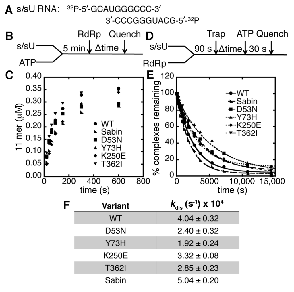 The Sabin amino acid substitutions do not substantially change the association or dissociation of RdRp complexes. (A) The s/sU RNA is 32P-labeled on the 5′ end for the association and dissociation assays; (B) the experimental design for the RdRp-RNA-NTP assembly assay. RNA (0.5 μM duplex) and 500 μM ATP (i.e., which will template against U) were pre-incubated for 5 min at 30 °C before the addition of 1 μM RdRp. Reactions were quenched at the indicated times by adding 25 mM EDTA; (C) comparisons of the RdRp-RNA-NTP assembly assay for WT (●), D53N (■), Y73H (▲), K250E (♦), T362I (▼) and Sabin (◣) RdRp. The Sabin I RdRp contains all four amino acid substitutions (i.e., D53N, Y73H, K250E and T362I); (D) the experimental design for the RdRp-RNA dissociation assay. RdRp (1 μM) and RNA (0.1 μM) were pre-incubated at 30 °C for 90 s before the addition of 100 μM unlabeled RNA (i.e., “trap”). After the indicated times, the reaction buffer was mixed with 500 μM ATP and then quenched after 30 s by the addition of 25 mM EDTA; (E) the RdRp-RNA dissociation assays for WT (●), D53N (■), Y73H (▲), K250E (♦), T362I (▼) and Sabin (◣) RdRp. The lines represent the data fits to a single exponential function; (F) the RdRp-RNA dissociation rate constants derived from the data in panel (E). The dissociation rate constants for the RdRp variants are not substantially different from the WT enzyme.