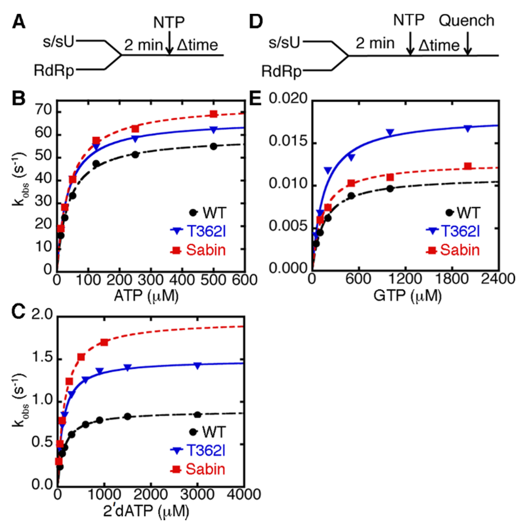 The Sabin I RdRp discriminates less against nucleotides with an incorrect 2′-deoxyribose sugar, but maintains nucleobase fidelity similar to WT enzyme (A) experimental design for the single nucleotide incorporation assay using ATP and 2′-dATP. RdRp (1 μM) was pre-incubated with s/sU RNA (1 μM), before being quickly mixed with equal volume of ATP or 2′-dATP with different concentrations. These reactions were monitored by fluorescence changes over time using a stopped-flow apparatus. Kinetic data for (A) AMP and (B) 2′-dAMP incorporation are plotted. The results for WT, T362I, and Sabin RdRp are shown in black, blue, and red, respectively. The lines represent data fit to a hyperbola function to give an apparent dissociation constant (Kd,app) and a maximal rate constant for nucleotide incorporation (kpol); (D) the experimental design for the single nucleotide incorporation assay using GTP. RdRp (1 μM) was pre-incubated with s/sU RNA (1 μM) at room temperature for 3 min and then at the assay temperature of 30 °C for 2 min, before being quickly mixed with equal volume of GTP at different concentrations. In this case, RNA was 32P labeled on 5′-end; and (E) kinetic data for GMP incorporation are plotted in black, blue, and red for WT, T362I and Sabin RdRp respectively. The lines represent data fit to a hyperbola function to yield Kd,app and kpol values.