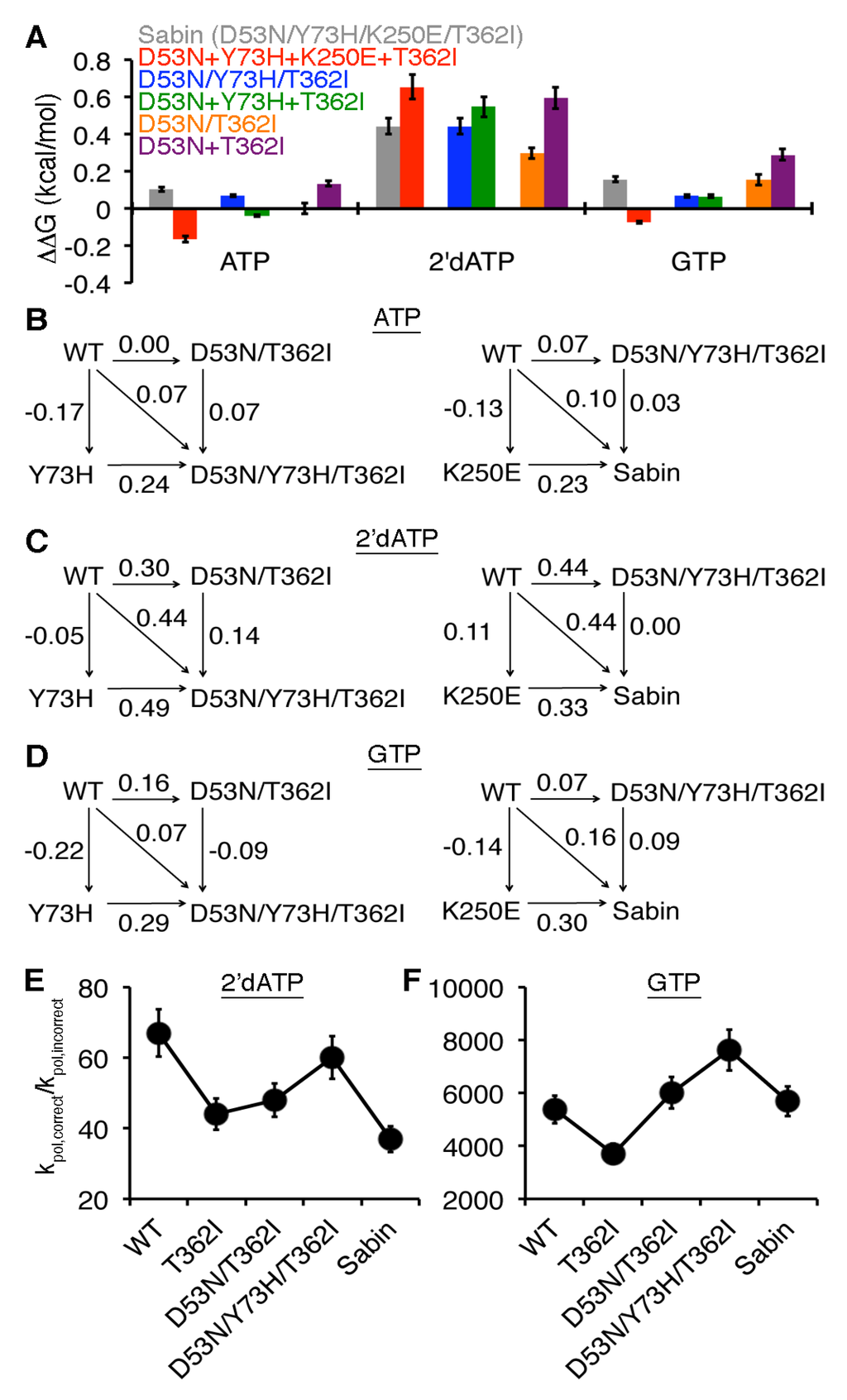 The Sabin I amino acid substitutions are cooperative. (A) Comparisons of single-substituted variants with multi-substituted variants. In this case, ΔΔGX = RT ln((kpol/Kd,app)X/(kpol/Kd,app)WT) where X is a particular enzyme variant. The ΔΔG result for the Sabin variant with all four amino acid substitutions (D53N/Y73H/K250E/T362I) is in grey, and is compared to the sum of the effects for all four single variants in red (i.e., ΔΔG(D53N) + ΔΔG(Y73H) + ΔΔG(K250E) + ΔΔG(T362I)). Likewise, the ΔΔG result for the triple variant D53N/Y73H/T362I is in blue and is compared to the sum of the effects for the three single variants in green. The ΔΔG result for the double variant D53N/T362I is in orange and is compared to the sum of the effects for the two single variants in purple. The ΔΔG values for the multi-variants are also compared using thermodynamics cycles when (B) ATP, (C) 2′-dATP, and (D) GTP are the incoming nucleotides (templated against U); all values are reported as kcal/mol. On the left, the ΔΔG values for the triple variant D53N/Y73H/T362I are compared to those of the double variant D53N/T362I and single variant Y73H. On the right, the ΔΔG values for Sabin variant with all four amino acid substitutions are compared to those of the triple variant D53N/Y73H/T362I and single variant K250E. (E) Sugar and (F) nucleobase selectivities are also compared between WT, T362I, D53N/T362I, D53N/Y73H/T362I, and the Sabin RdRp.