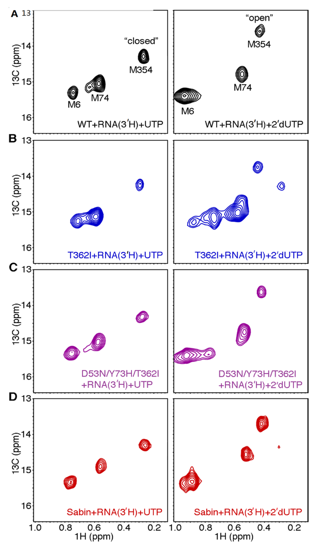 The Sabin I RdRp does not readily populate the closed conformation when incorrect nucleotide binds. [Methyl-13C] Met 1H-13C HSQC spectra for (A) WT; (B) T362I; (C) D53N/Y73H/T362I; and (D) Sabin I RdRp when the enzyme is bound with s/s RNA lacking a 3′-OH group and (left) correct UTP nucleotide or (right) incorrect 2’-dUTP nucleotide. Spectra were collected at 293 K with 250 μM RdRp, 1000 μM s/s RNA, and 4 mM UTP or 8 mM 2′-dUTP.