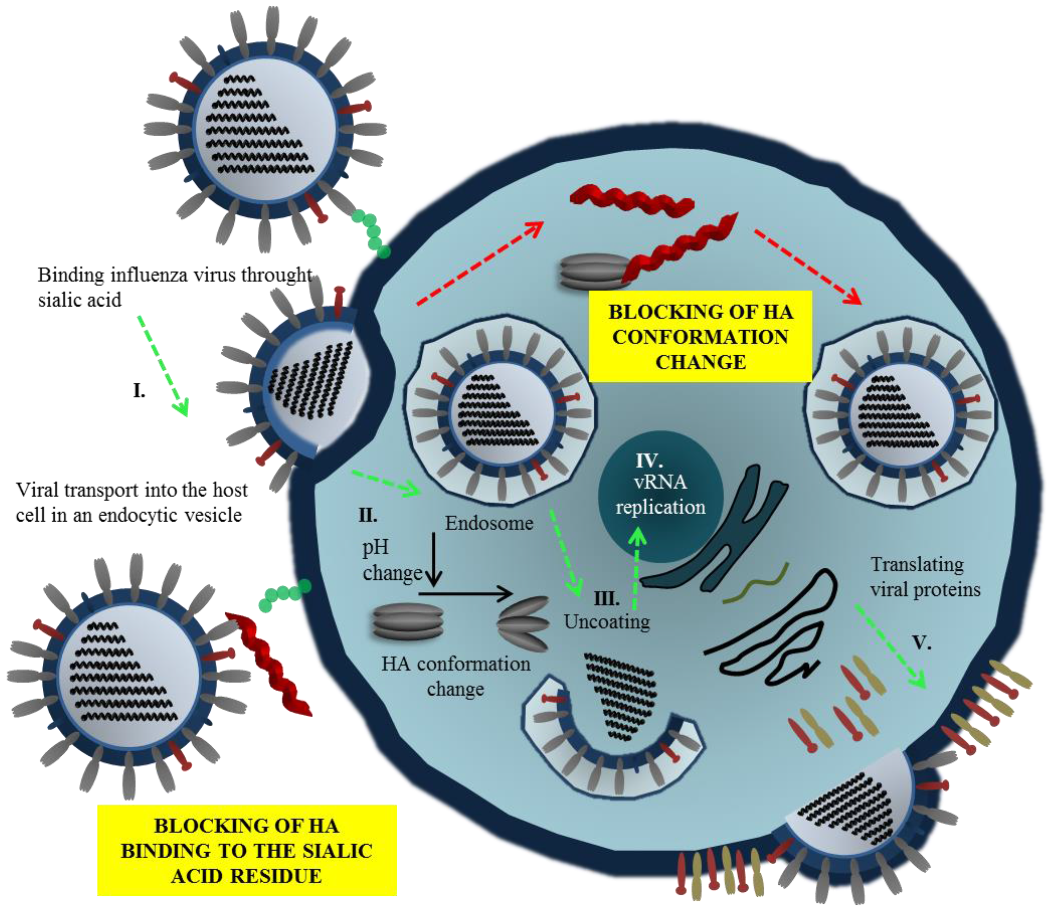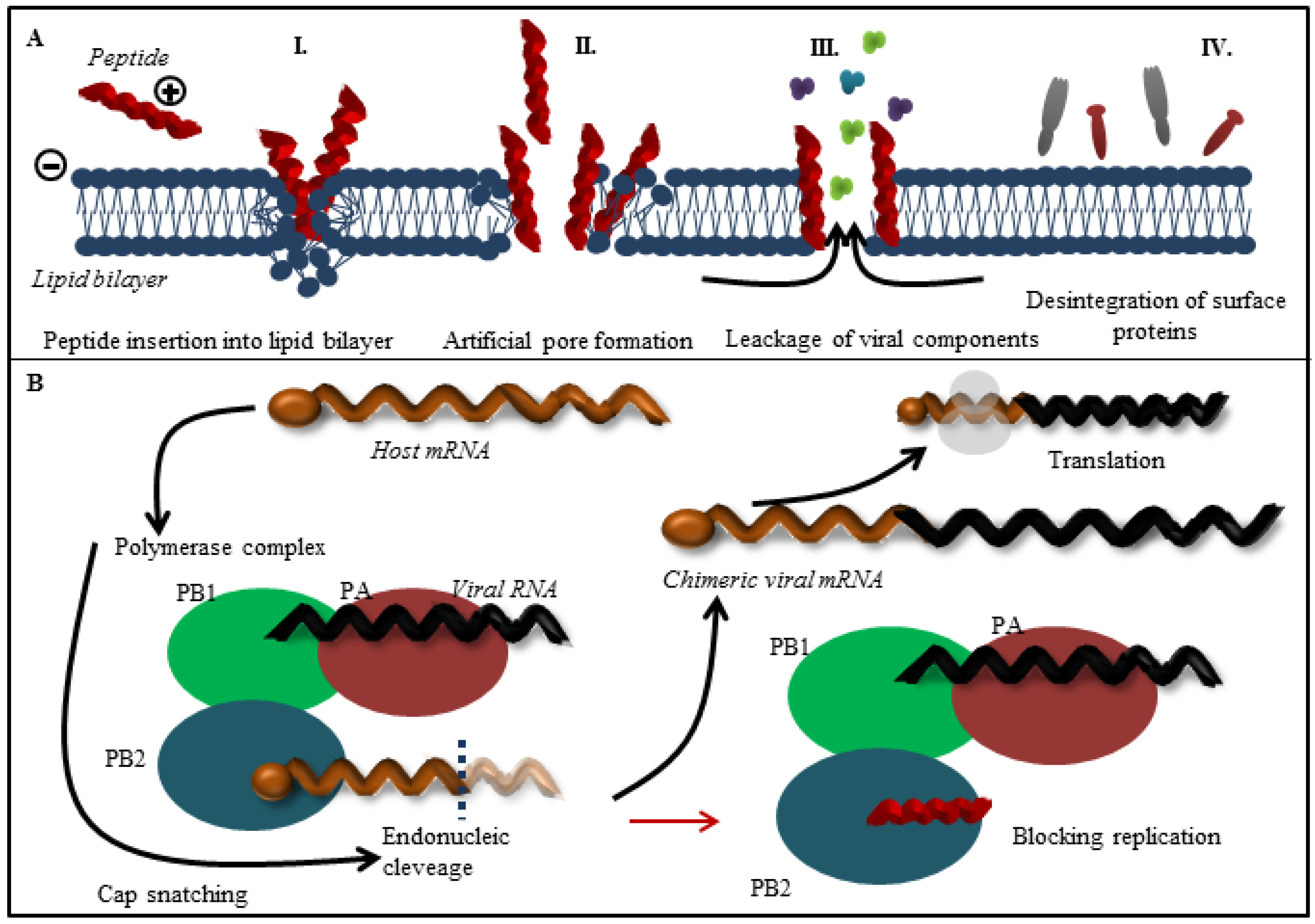 Influenza is highly contagious, febrile and influenza viruses cause acute respiratory disease. Influenza viruses cause illness with significant morbidity and mortality worldwide and they are considered as potential pandemic agents due to their high mutation rate, which may result in the formation of new subtypes [9,10]. The emerging threat of novel pandemic influenza strains spreading into the human population, as well as increasing resistance against conventional antiviral drug encouraged research efforts to develop new therapies against influenza viruses [11,12,13,14]. In our review, we present a comprehensive overview of peptides with therapeutic potential against specific targets of influenza viruses.
