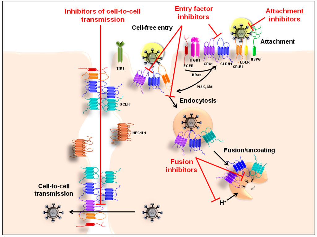 Schematic representation of HCV entry. The initial viral attachment on the basolateral membrane of hepatocytes is believed to involve the interaction of the viral particle—both viral (HCV envelope glycoproteins) and host-derived (apolipoproteins) factors—with HSPGs (heparan sulfate proteoglycans), LDLR (low density lipoprotein receptor) and SR-BI (scavenger receptor class B type I). Following interaction between the virus and different host factors expressed at the hepatocyte cell surface, including CD81 (cluster of differentiation 81) and CLDN1 (claudin 1), as well as rearrangement of cell surface proteins, the virus is ultimately internalized into its host cell via clathrin-mediated endocytosis. Additional host factors, including EGFR (epidermal growth factor receptor), NPC1L1 (Niemann-Pick C1-like 1) and TfR1 (transferrin receptor 1), contribute to the HCV entry process, for example by modulating intracellular signaling pathways or endocytosis. Following acidification of the endosome and subsequent fusion of viral and endosomal membranes, the viral genome is released into the cytoplasm. In addition to cell-free virus entry, HCV has also been described to transmit between hepatocytes through direct cell-to-cell transmission involving CD81, SR-BI, CLDN1, OCLN (occludin), EGFR, EphA2 (ephrin receptor A2) and NPC1L1. HTAs can interfere with different steps of the HCV entry process as highlighted in red.