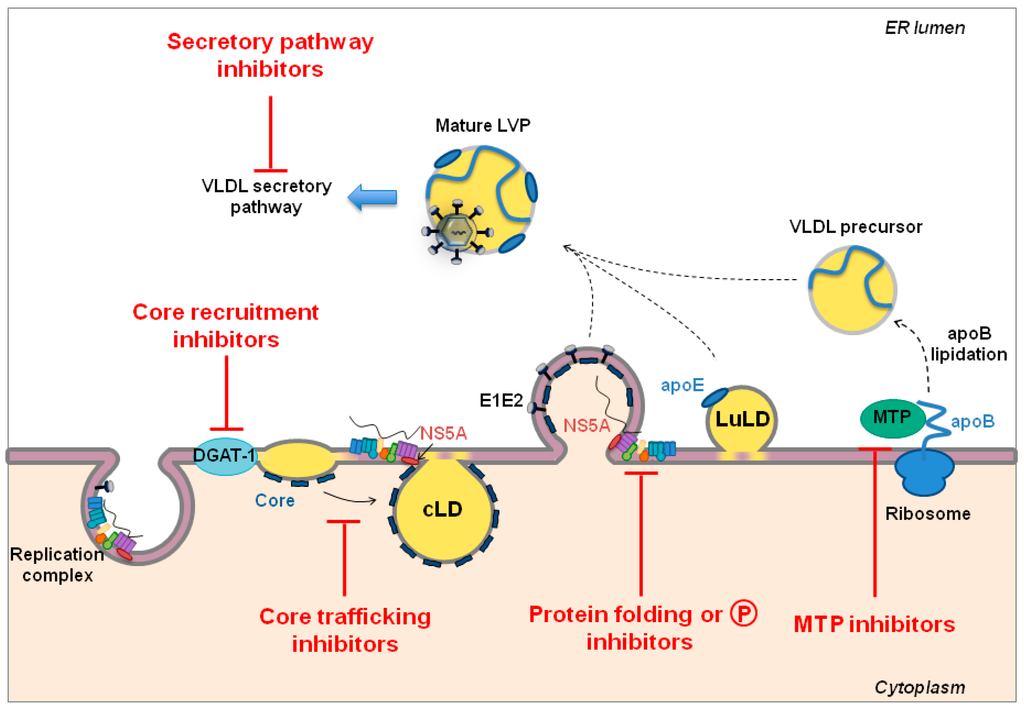 Schematic representation of HCV assembly. Virion assembly is triggered by core recruitment on cytosolic lipid droplets (cLDs) by the diacylglycerol acyltransferase-1 (DGAT-1). In turn, replication complexes are recruited through core-NS5A interactions. Nucleocapsid formation is mediated by viral budding into the ER lumen, at the site of VLDL production. The immature viral particles fuse or attach to a luminal LD (LuLD) through apoE-E1E2 and apoE-NS5A interactions. During VLDL synthesis, apolipoprotein B (apoB) is directly produced in the ER lumen and enriched in lipids by the microsomal triglyceride transfer protein (MTP) to generate VLDL precursors. Viral particles merge with these nascent VLDLs to generate mature lipoviroparticles (LVPs). LVPs enter the VLDL maturation and secretion pathway to be released from hepatocytes. HCV assembly and egress can be impaired by targeting different steps of these processes as highlighted in red.
