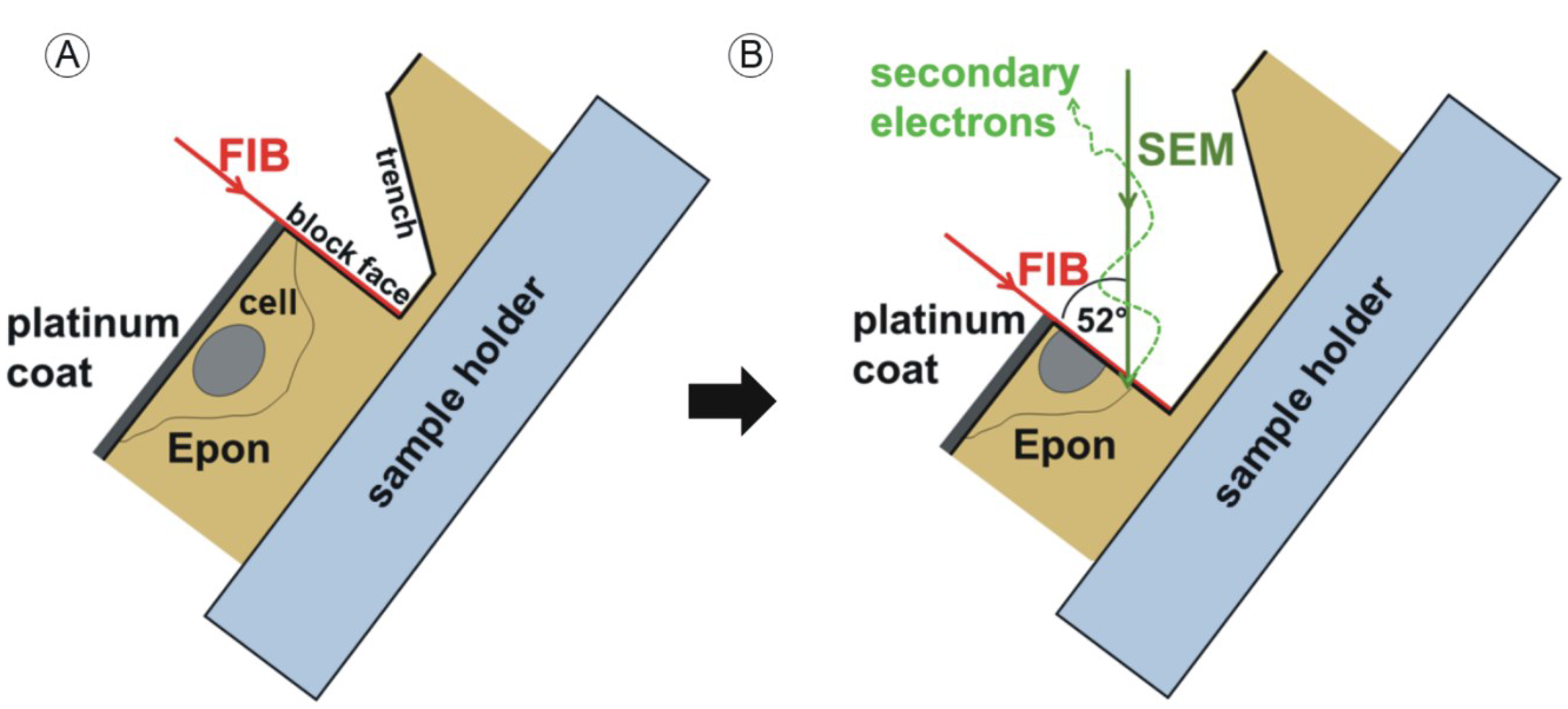 Sample manipulation by the focused ion beam (FIB) and image acquisition with the scanning electron microscope (SEM) beam. Sample preparation is described in [39]. Embedded HCMV infected fibroblasts are located directly under the surface of the approximately 1 mm high Epon block. The sample is coated with a thin platinum layer prior to mounting into the dual beam microscope. The area of interest is chosen at 10 kV acceleration voltage. (A) The sample is then tilted to 52° and a trench is FIB-milled into the Epon block, generating a new surface (block face); (B) Removal of the next thin layer (“slice”) of the sample generates a new block face. After every “slice” step the generated block face is imaged by the scanning electron beam (“view”). The “slice and view” cycle is repeated to gain a three-dimensional dataset of the volume of interest. Reprinted from [38] Figure 1 with kind permission from Springer Science+Business Media.