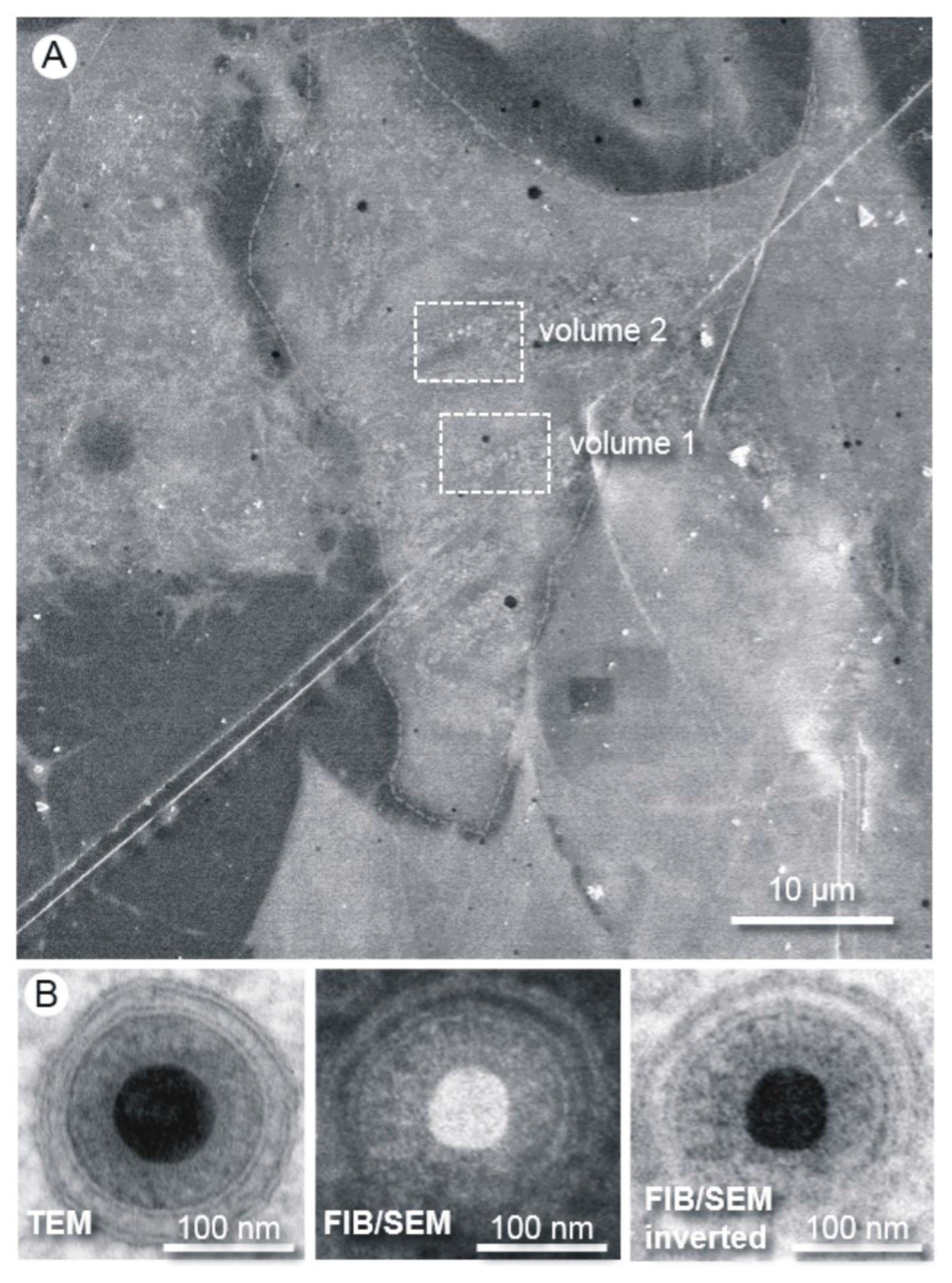 Methodology and resolution of FIB/SEM tomography. (A) The Epon embedded cells are first visualized by SEM at an acceleration voltage of 10 kV. A region of interest can be easily chosen for the subsequent “slice and view” process. The boxes show the positions of the volumes chosen for FIB/SEM tomography; (B) Images of human cytomegalovirus (HCMV) particles acquired from an ultrathin section by transmission electron microscopy (TEM) and from the block face by FIB/SEM. The high resolution of the FIB/SEM image allows clear visibility of the two leaflets of the lipid bilayer. The secondary electron SEM image was acquired with an acceleration voltage of 5 kV.