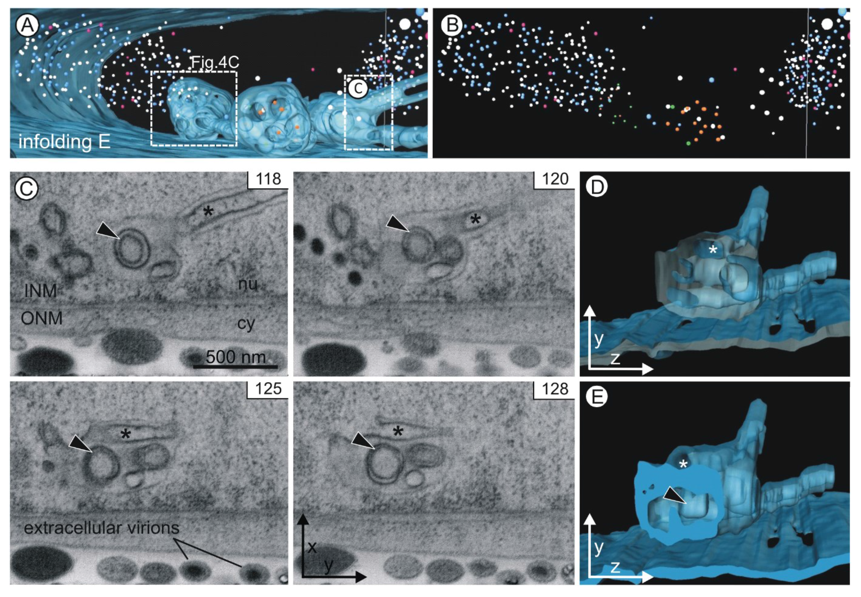 Infolding E. (A) Two large spherical segments (diameters 1 µm) are connected by a tubular segment (diameter ~180 nm). A smaller spherical segment at the front branches out into two tubular segments. The boxes mark the position of the details depicted in Figure 4C and Figure 5C–E; (B) Presentation of the capsids alone shows the cloud-like structure of the nucleoplasmic capsids; (C) A 3rd order infolding (arrowhead) is visible in a sequence of more than ten images (see Movie S4). The images also show an invagination within the tubular segment (asterisk). Its connection with the nucleoplasm is evident in image 128. INM inner nuclear membrane, ONM outer nuclear membrane, nu nucleoplasm, cy cytoplasm; (D,E) The yz view of the three-dimensional model shows the opening of the invagination (asterisk). The model is depicted without capsids.
