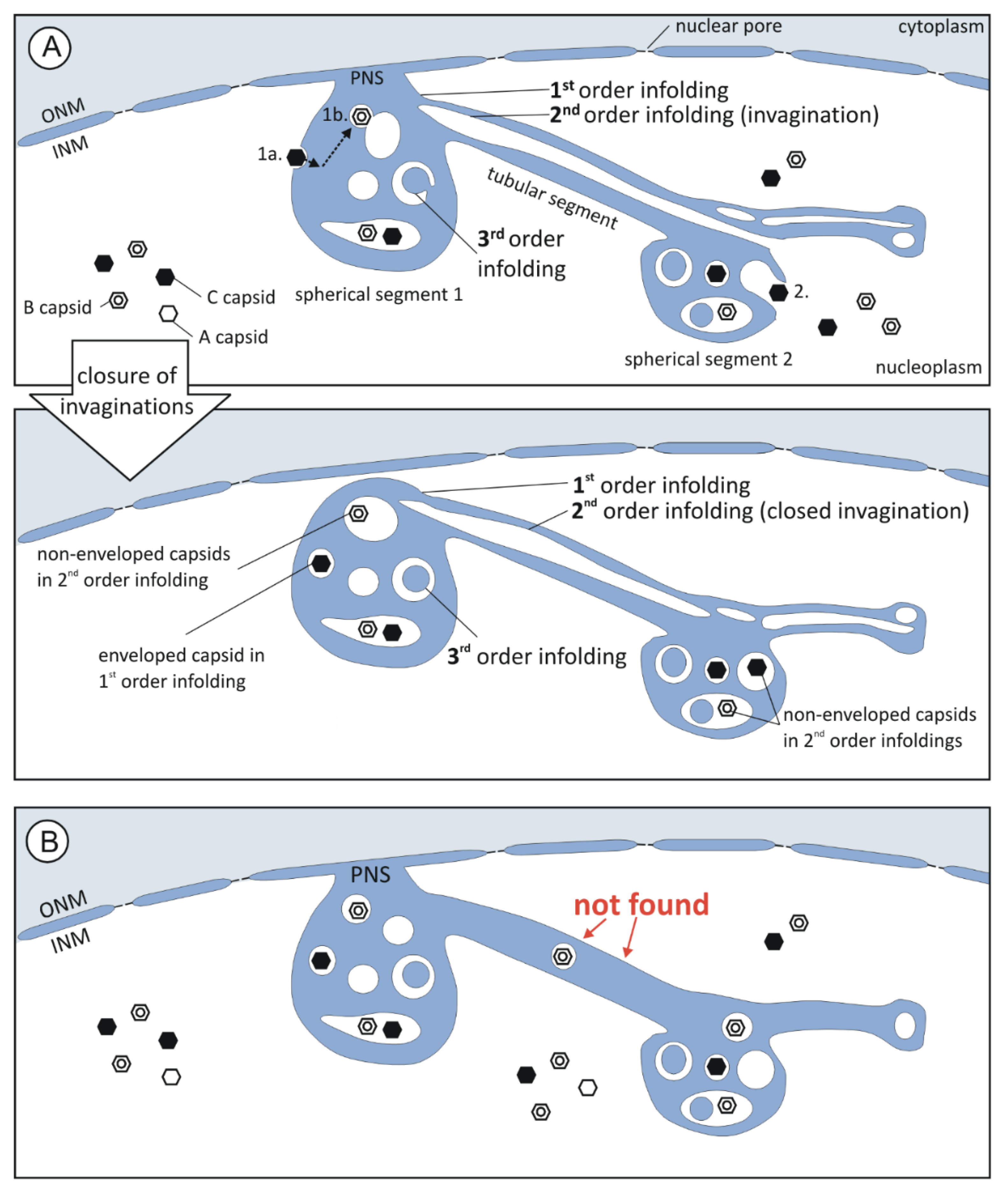 Summary of the architecture of intranuclear membrane structures revealed by FIB/SEM tomography. (A) Model describing infolding formation: The hierarchy of the compartments (1st, 2nd, and 3rd order infolding) could be explained by invagination of membrane into the respective compartment and subsequent membrane fission. Thus, the lumen of 1st and 3rd order infoldings equals the perinuclear space (PNS, blue) and the lumen of 2nd order infoldings the nucleoplasm (white). Non-enveloped capsids were only found in the nucleoplasm and 2nd order infoldings, enveloped capsids only in the lumen of 1st order infoldings; (1a.) It seemed obvious that enveloped capsids result from capsid budding into 1st order infoldings. (1b.) Capsid envelopes might be able to fuse with membranes of 2nd order infoldings, resulting in non-enveloped capsids in 2nd order infoldings; (2.) Alternatively, non-enveloped capsids in 2nd order infoldings could result from capsid trapping during formation of invaginations; (B) We never found tubular segments with capsids. Tubular segments always contained 2nd order infoldings.