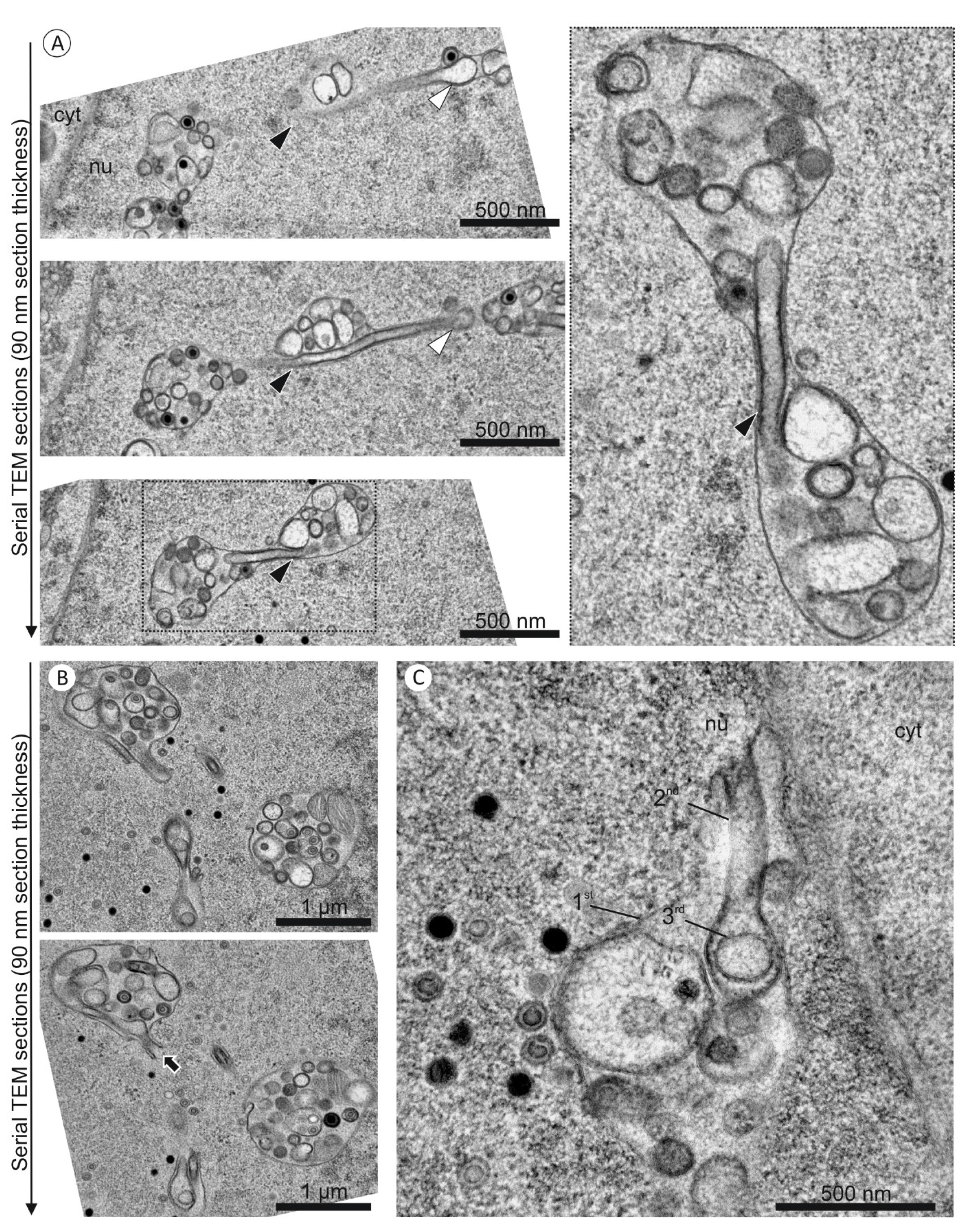All nuclear infoldings in the two-dimensional micrographs contained various vesicles and most of them also contained capsids (Figure 3, Figure 4 and Figure 5). Only after detailed analysis by three-dimensional FIB/SEM imaging we discovered a hierarchical organization of the nuclear infoldings (Figure 4 and Figure 5): All 1st order infoldings contained at least 2nd order infoldings. Some 2nd order infoldings could clearly be identified as originating from invaginations into 1st order infoldings (Figure 5C, image 128). Within the 2nd order infoldings again 3rd order infoldings could be identified (Figure 4 and Figure 5C, black arrowheads). Sometimes 2nd order infoldings also contained viral capsids (Figure 4C).
