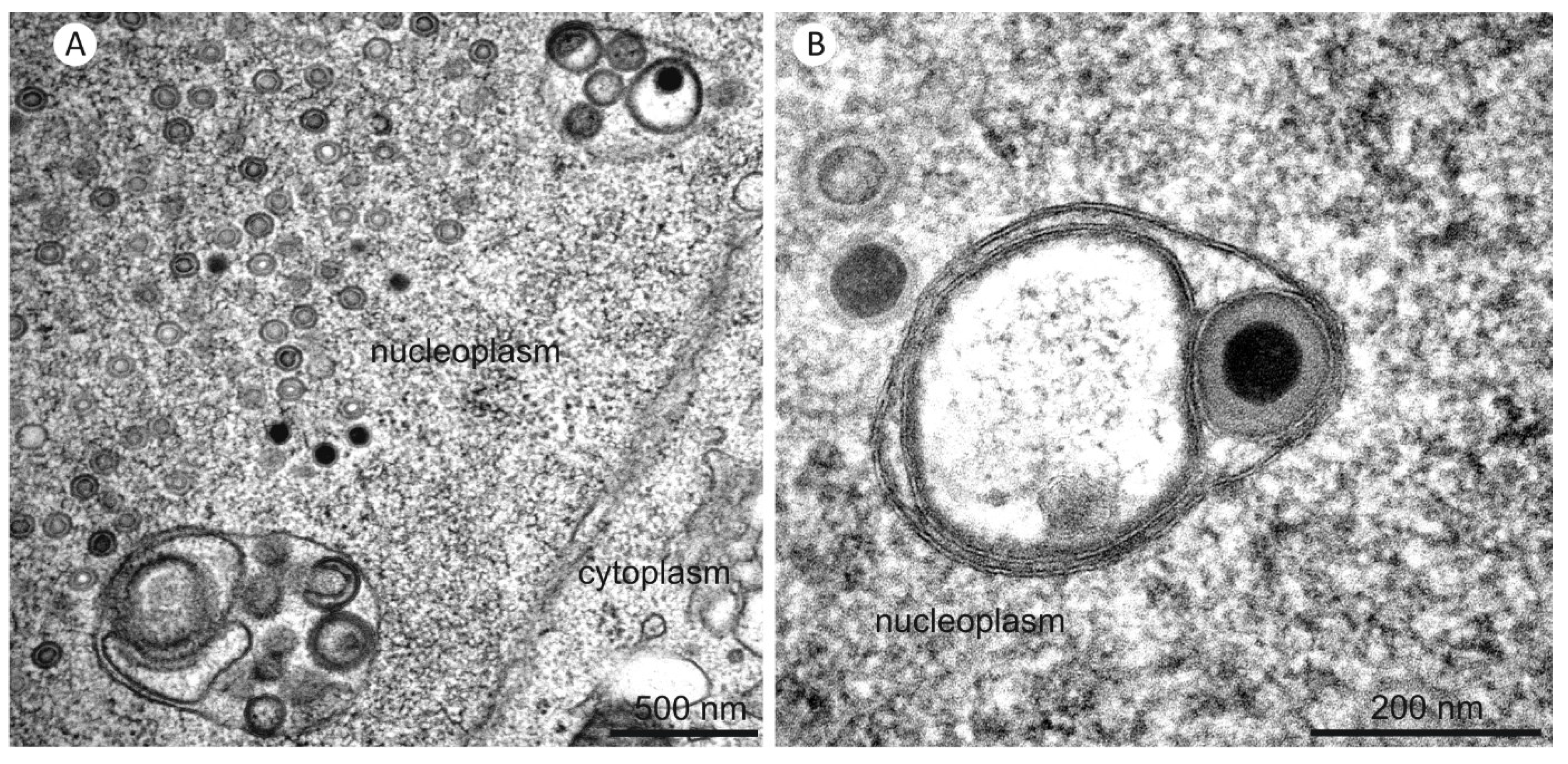 TEM imaging was also used to show that nuclear infoldings were already present at three days post infection with no apparent structural difference (Figure 8). At this time nuclear capsids started accumulating in the nucleoplasm and could also be found in infoldings.
