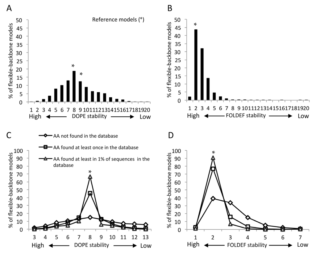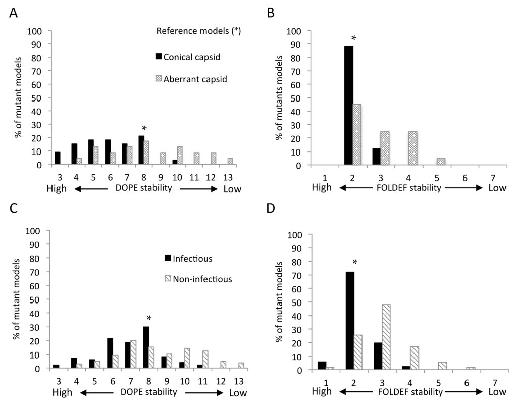 Distribution of capsid protein mutant stabilities based on flexible-backbone models of the mature capsid (CA) hexamer. The stability bin reflects the structural stability from higher (left) to Revise the asterisks into Palatino linotype. lower (right) levels. * indicates the bin in which reference structures were found. All mutations predicted by Discrete optimized protein energy (DOPE) (A,C) and FoldX energy function (FOLDEF) (B,D) were classified into three groups based on their frequency in the HIV sequence database. Only results from five higher, five lower and the reference model bins are shown, as together they accounted for more than 98% of all models.