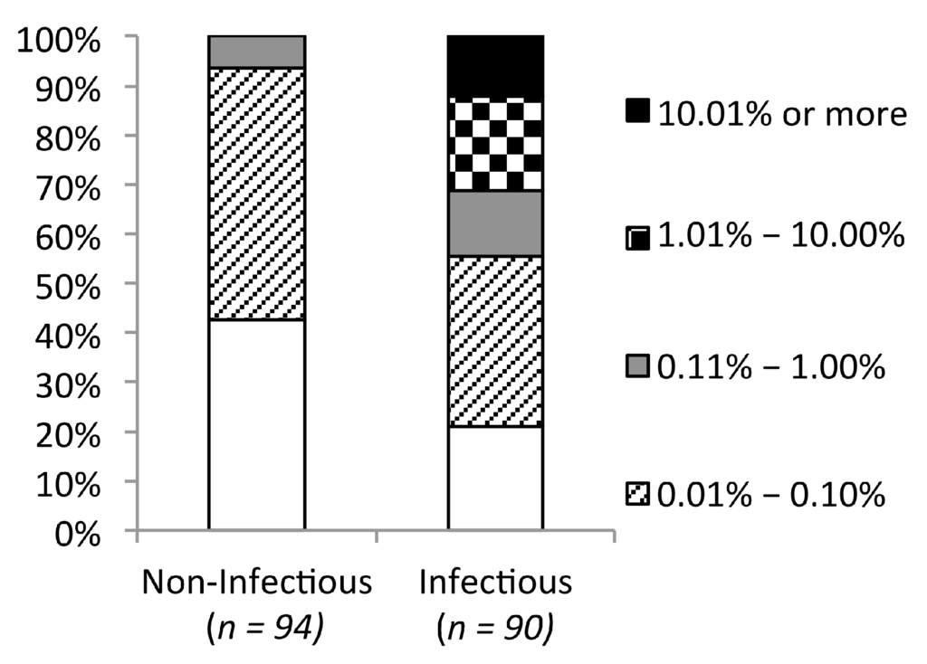 The observation that the majority of observed mutations were not predicted to alter protein stability, in contrast to unobserved mutations, suggests that any mutation found in the database has a high likelihood of being tolerated. To explore this question, we examined the frequency of 184 point mutations with known impact on infectivity in subtype B HIV-1. The mutated residues were scattered throughout the CA, with 70% located in the NTD and the rest in the CTD. Seventy percent of the mutations were random, the other approximately 20% were alanine substitutions and the rest were the most frequently observed mutations [9,11,14,16,35,36,37,38,39]. As the previous studies did not always use the same experimental methods to determine viral infectivity, we used our own threshold for separating infectious and non-infectious mutations. The mutant viruses were considered non-infectious when no viral production was observed or when the reported infectivity was lower than 1% of the wild type virus. Ninety-four (48%) of these mutations resulted in non-infectious viruses defined in this way. Forty of the 94 (42.5%) mutations that destroyed infectivity were not found in the database, while the remainder were found at least once. However, none were found in more than 0.2% (11 of 5811) of the sequences. While the database frequency of inactivating mutations ranged from 0% to 0.2%, the frequency of infectivity-conserving mutations ranged from 0% to 36%. Nineteen out of 90 of the latter mutations (~21%) had not been observed in the HIVDB, while 37 (41%) were present in more than 11 sequences (Figure 2). Overall, inactivating mutations appeared at a significantly lower frequency than tolerated mutations (p = 3.03 × 10−8; Mann–Whitney U test). Using mutation frequency as a predictor for the impact on mutant infectivity, the threshold of 0.2% yielded the best prediction accuracy (64%) (Table 1).