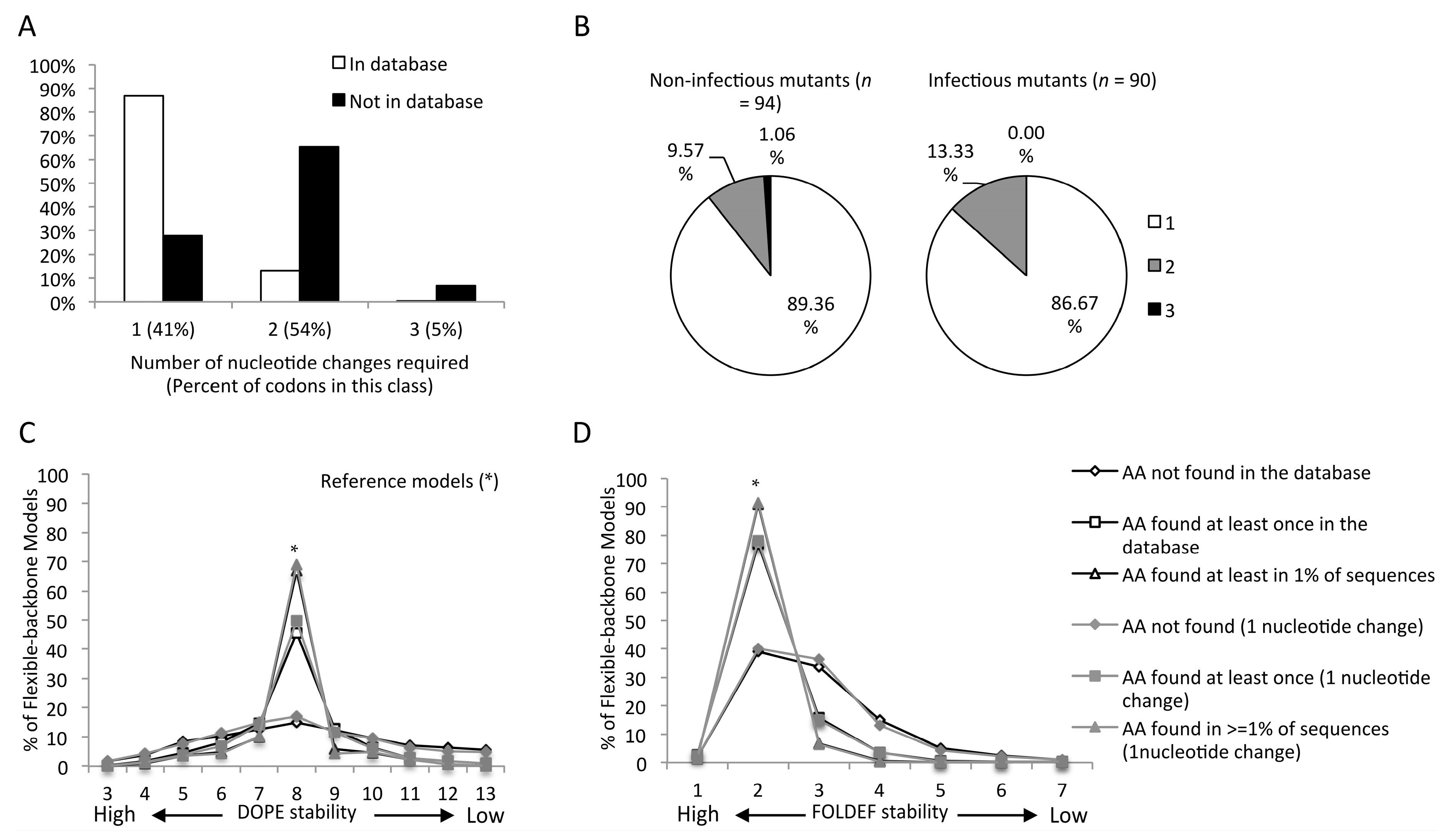 Genetic barrier influences the emergence of amino acid mutations but not impact of mutations on viral infectivity: (A) Number of nucleotide changes required for mutations observed and not observed in the HIV database of 5811 sequences; (B) Number of nucleotide changes required for mutations whose impact on infectivity was tested; amino acid mutations classified into three groups based on their frequency in the HIV database with stability predicted by DOPE (C) and FOLDEF (D) using the mature CA hexamer as the template.