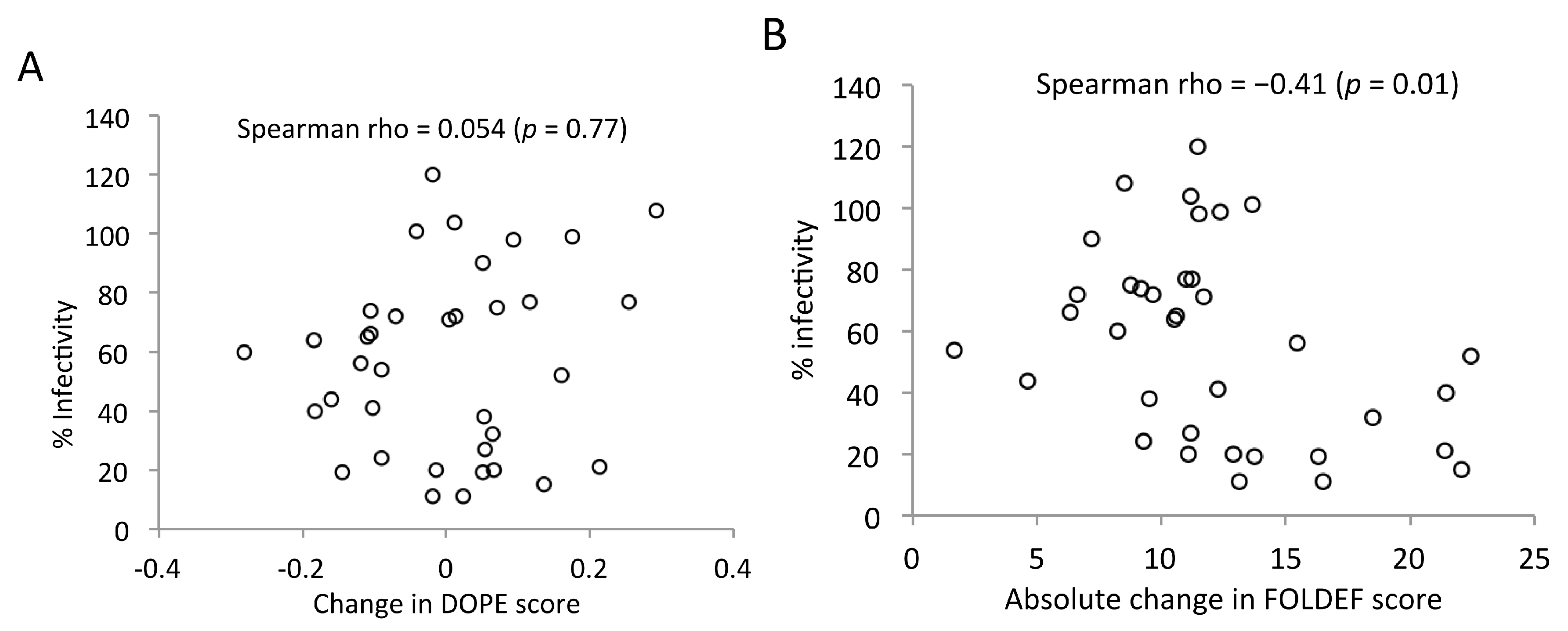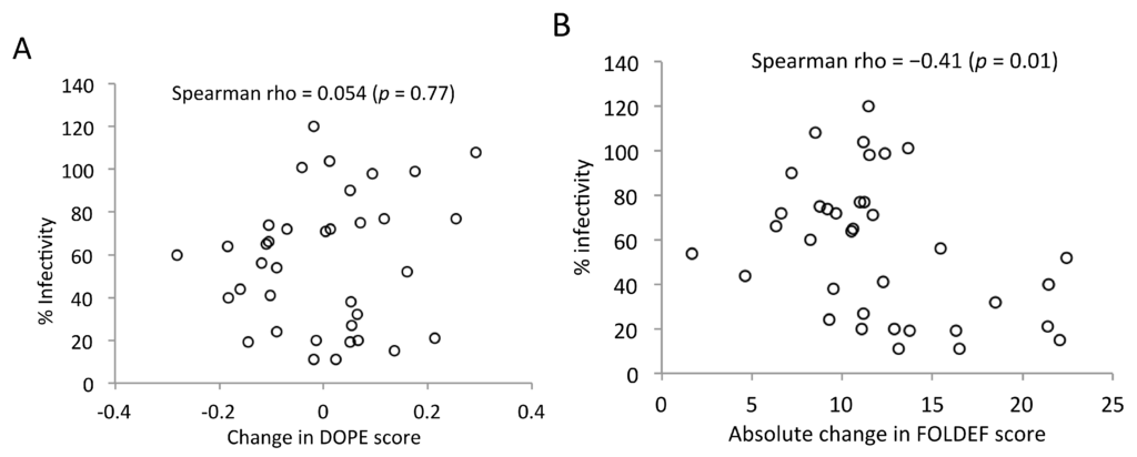 Relationship between viral infectivity and change in stability compared to the reference structure. As predicted by (A) DOPE and (B) FOLDEF. Each open circle represents a point mutation (viral infectivity data taken from [16]).