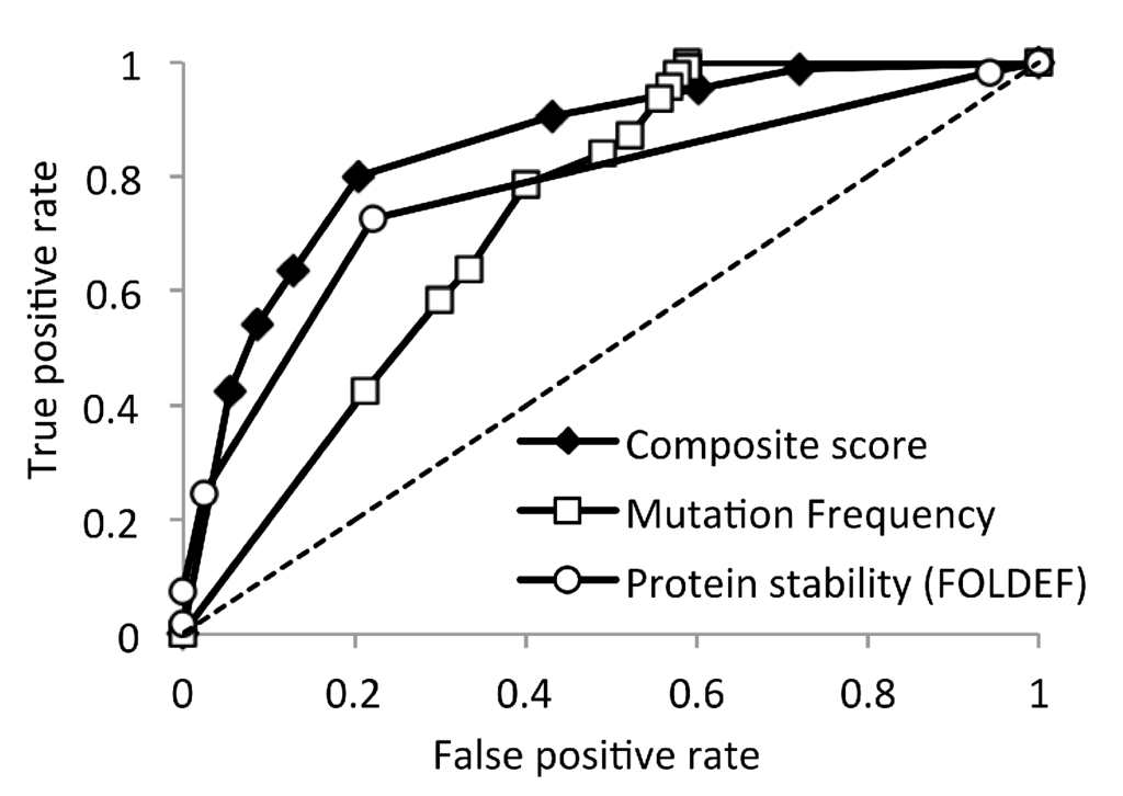 Receiver operating characteristic curve of HIV-1 subtype B non-infectious mutations predictions. The composite score is the sum of the FOLDEF-stability rank and the mutation-frequency rank.