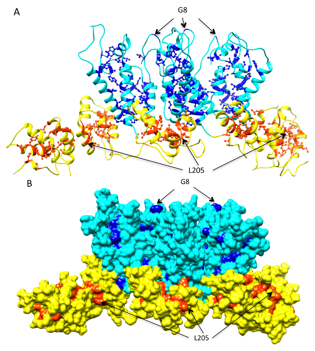 Two in silico mutation modeling approaches were applied: Fixed-backbone models explore the best-fit side-chain conformation while the main chain atoms of the mutated residue are kept unchanged from the original position in the template structure. The side-chain atoms of the mutated residue were replaced with those of the new amino acid. The best-fit side chain conformation was selected using the SCWRL program version 4.0 (Fox Chase Cancer Center, Philadelphia, PA, USA) [67]. The model was then run through 200 steps of energy minimization to remove atomic clashes or internal constraints generated by side-chain replacement using the CHARMM force field, as implemented in the program NAMD version 2.8 (University of Illinois, Champaign, IL, USA) [68]. Flexible-backbone models allow the main chain atoms to move along with the side chains and the best-fit combination is selected. These were generated in the FOLDX program suite [69] using the BUILDMODEL function with default parameters. This method allows the neighboring side-chains to be moved in order to explore alternative backbone conformations.