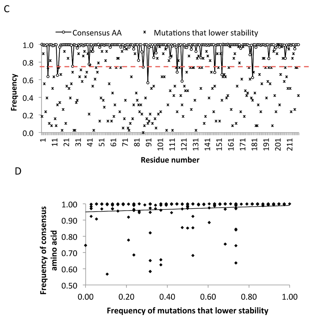 Despite the rapid evolutionary rate of HIV-1, the viral capsid protein (CA) remains relatively conserved, with two-thirds of the protein having consensus amino acid frequencies of 0.9 or greater. The capsid plays several important roles in the viral replication cycle [20,21] and is an emerging target for novel HIV drugs (Reviewed in [22]). It is also a target for host cellular immune responses that have been associated with viral control in both humans [23] and in non-human primate model systems [24,25]. Recent studies suggest that specific regions of the HIV-1 Gag polyprotein, which contains the CA, remain highly conserved due to structural constraints, with sites buried in the core of the protein [26] and at CA multimer interfaces [15] being especially important. Another study reported an association between fitness costs of single amino acid changes in HIV-1 Gag and absolute changes in predicted protein stability. These findings suggest that predicted protein stability might be a useful tool for identifying amino acid residues crucial for Gag structure and function. However, only 29 of 500 residues of the Gag polyprotein were evaluated [27].