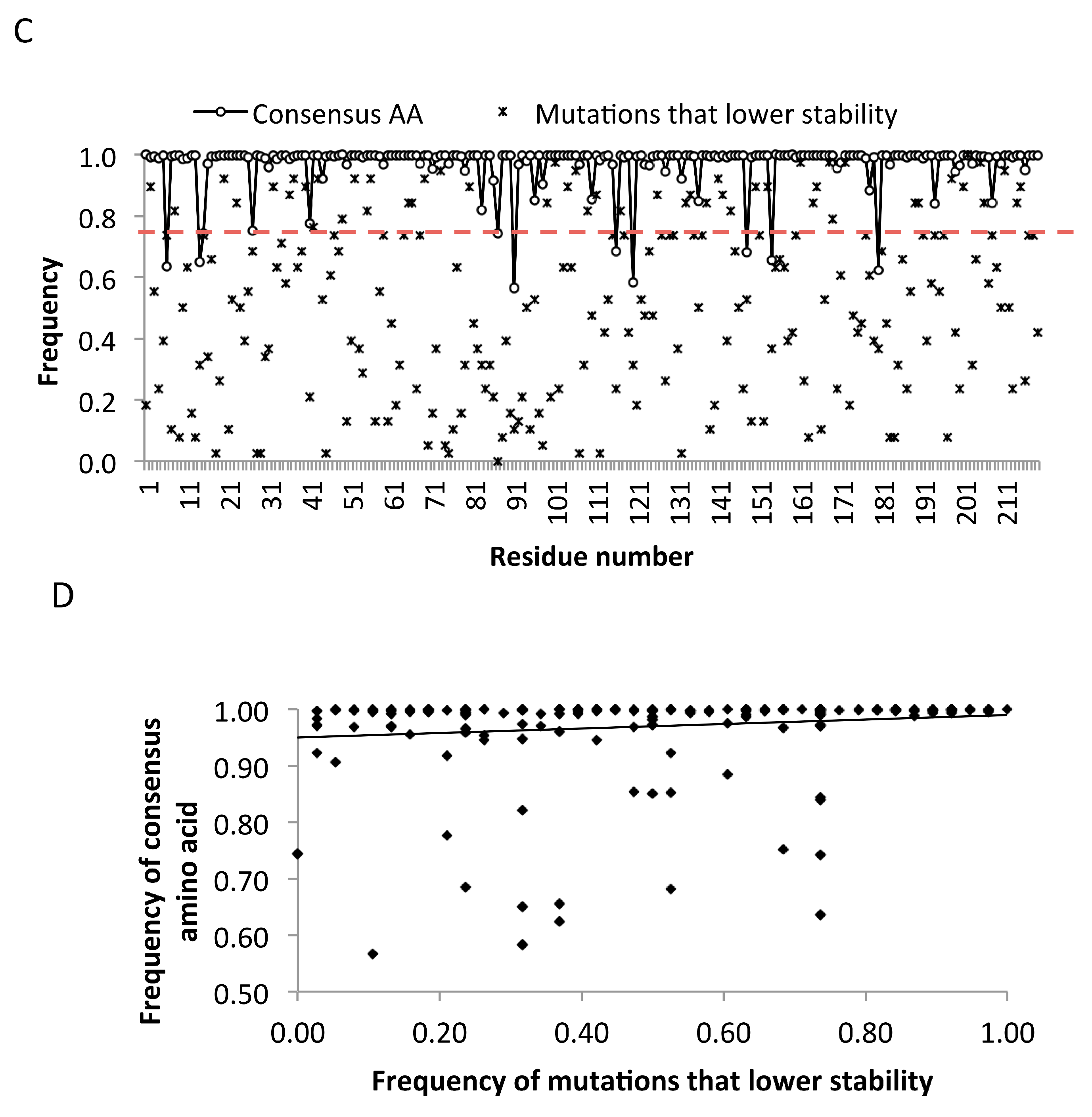 As computational power and techniques for protein structure and stability predictions continue to improve, the performance of our approach could likewise be improved. It should be noted that our in silico mutation step did not include a molecular dynamic (MD) step, however, a previous study [63] observed no relationship between MD structural convergence and the FOLDEF stability. Using any one MD snapshot as the input template yielded poorer predicted stability, while using the MD-averaged structure gave comparable results to the initial crystal structure [63]. There are several approaches for MD simulations and different methods may improve the stability prediction. However, given the resources needed for detailed MD analyses with a large number of mutant models, we did not explore them in this study. To the best of our knowledge, there is not yet an effective way to computationally predict point mutations that drastically alter the protein tertiary structure without affecting protein stability. Our current method does not account for this possible, but rare, effect of mutations.