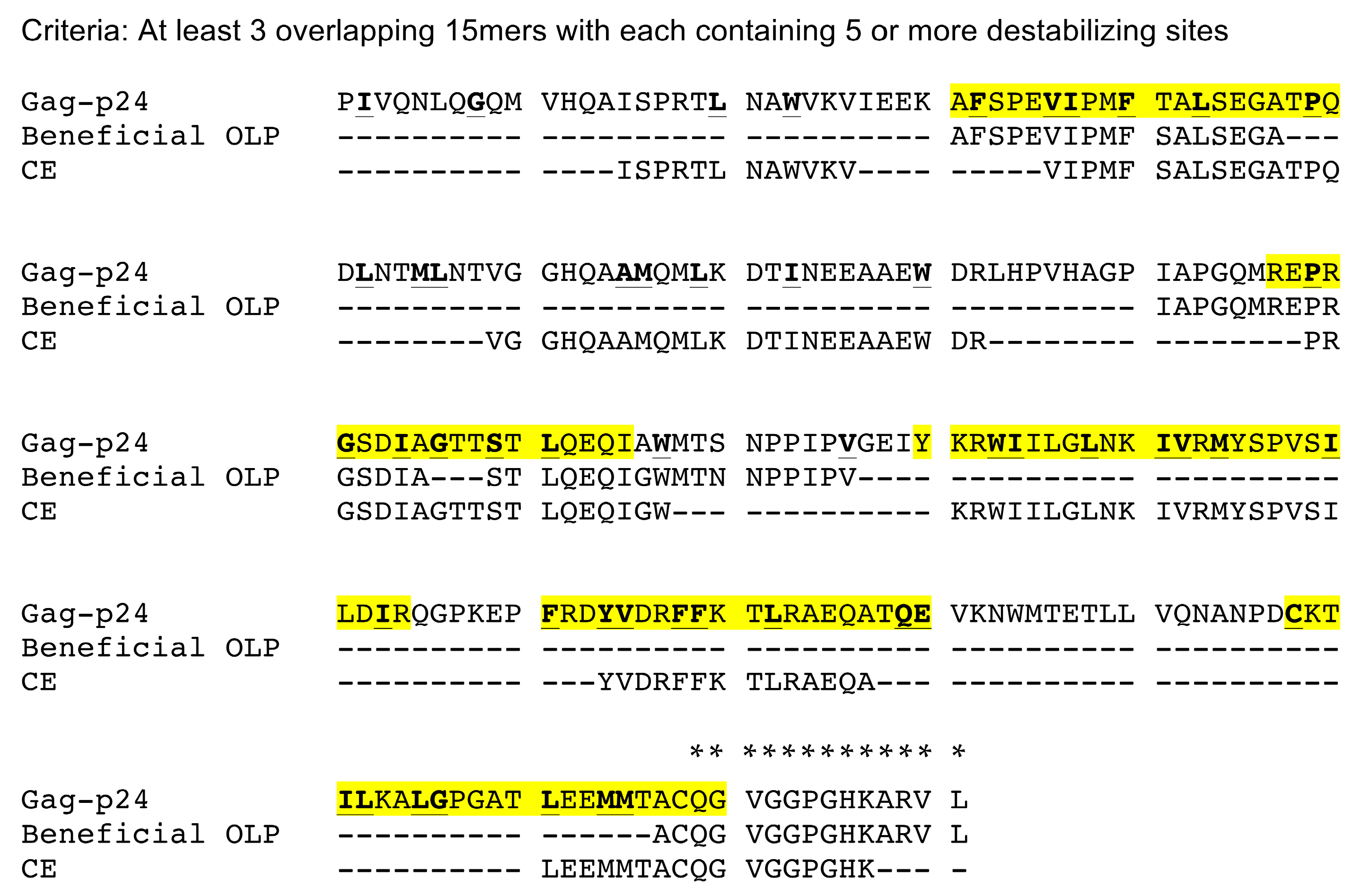 Clusters of sites prone to destabilizing mutations overlap with peptides shown to induce robust immune response and be associated with viral control. Positions prone to destabilizing mutations are underlined and bolded in HIV-1 Gag-p24 subtype B consensus sequence. Yellow regions depict four continuous stretches of sites found in three or more overlapping 15 amino acid windows with each window containing five or more destabilizing sites. CE peptides [3,14,41] and “Beneficial” peptides from [42] were previously shown to induce robust immune responses [43,44] and associated with viral control [42], respectively. * denote residues not included in all the template structures examined and, hence, excluded from the analysis.