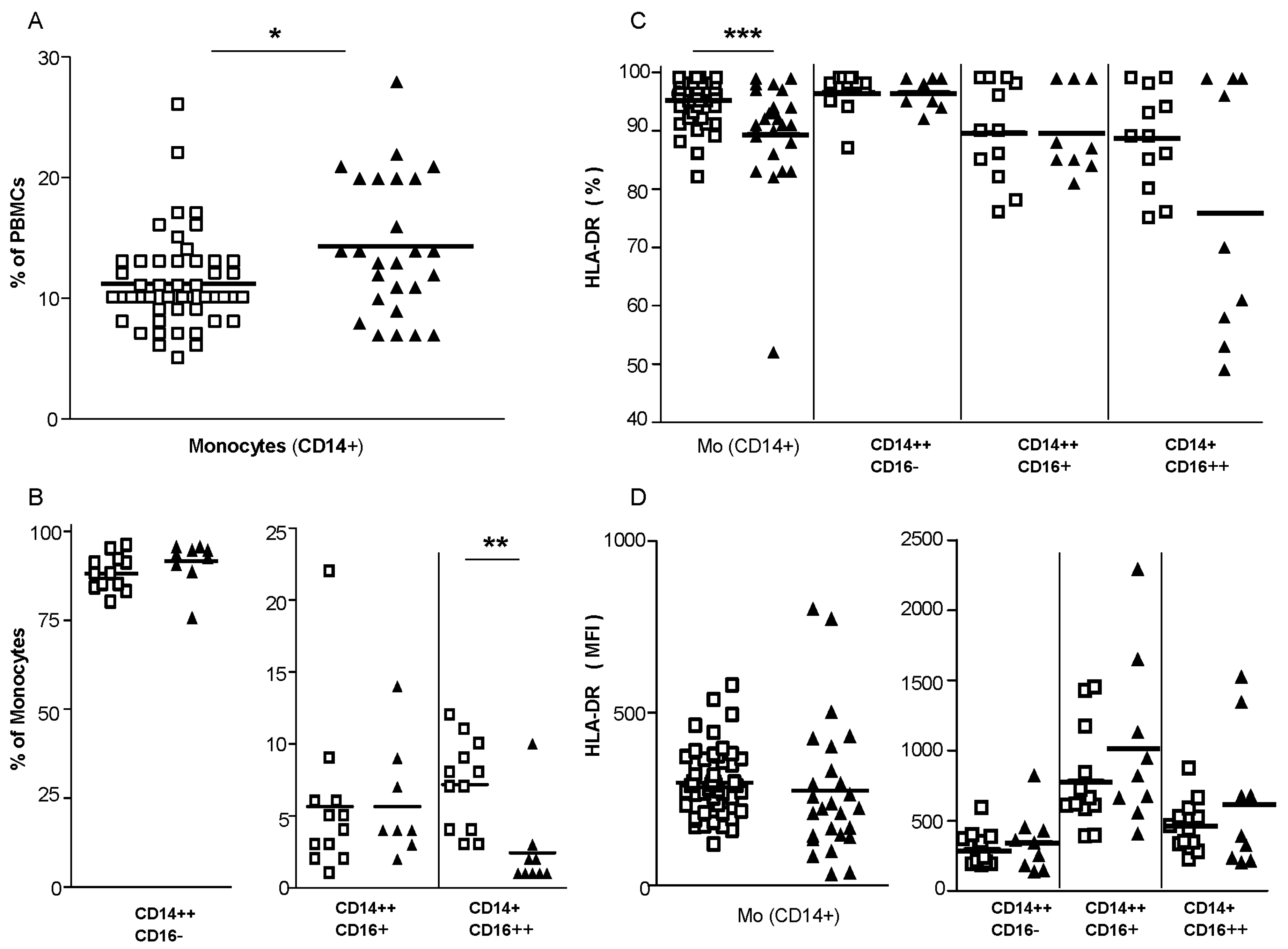 Changes in blood monocytes during TOSV infection. Peripheral blood mononuclear cells (PBMCs) from the study participants were stained with monoclonal antibodies for subsequent flow cytometric analyses. Monocytes (CD14+) were gated as described in Materials and Methods. Cell frequencies (A,B) and human leukocyte antigen (HLA)-DR expression levels (C,D) of the circulating monocytes are reported. N = 26 TOSV+ patients and n = 49 healthy controls were evaluated for total monocytes, while n = 9 TOSV+ patients and n = 12 healthy donors were analyzed for monocytic subsets. White squares indicate healthy controls and black triangles indicate TOSV-infected patients. MFI, mean fluorescence intensity. Data were analyzed using the non-parametric Mann–Whitney U test. * indicates p ≤ 0.05, ** indicates p ≤ 0.01 and *** indicates p ≤ 0.001.