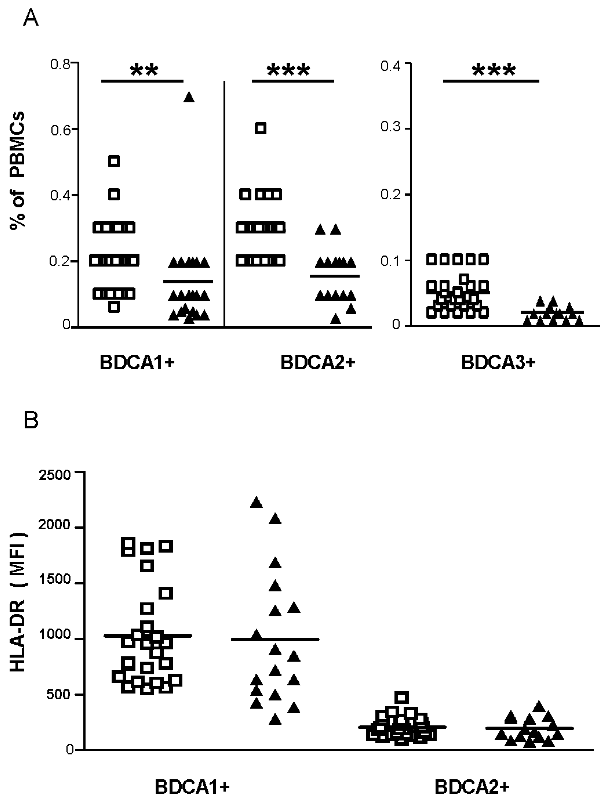 Cell frequencies and activation markers of circulating DCs (BDCA-1+, BDCA-2+, and BDCA-3+). Peripheral blood mononuclear cells (PBMCs) from the study participants were stained with monoclonal antibodies for subsequent flow cytometric analyses. mDCs (BDCA-1+ and BDCA-3+ DCs) as well as pDCs (BDCA-2+ DCs) were gated as described in Materials and Methods. Lower frequencies of circulating DCs were observed in TOSV-infected patients (A) with no difference in the expression levels of human leukocyte antigen (HLA) class II molecules compared to healthy controls (B). White squares indicate healthy controls and black triangles indicate TOSV-infected patients. N = 21 TOSV+ patients and n = 26 healthy controls were analyzed. MFI, mean fluorescence intensity. Data were analyzed using the non-parametric Mann–Whitney U test. ** indicates p ≤ 0.01 and *** indicates p ≤ 0.001.