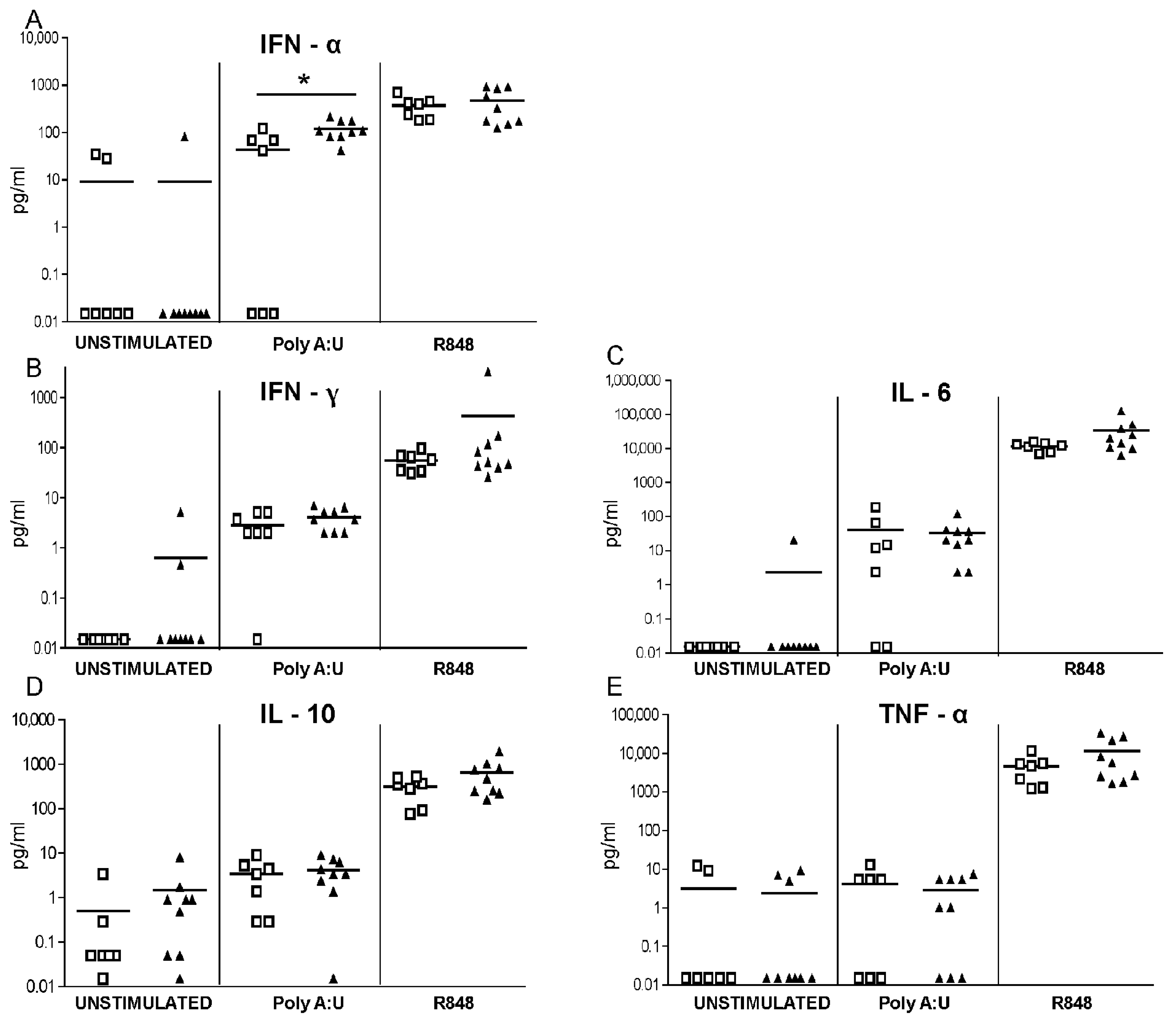 TLR-induced cytokine responses in blood cells from TOSV-infected patients and healthy controls. Blood cells were left unstimulated or stimulated with poly(A:U) (TLR3 ligand; 20 µg/mL) or Resiquimod-R848 (TLR7/8 ligand; 10 µg/mL). After 24 h, supernatants were collected and analyzed for cytokine levels. White squares indicate healthy controls and black triangles indicate TOSV-infected patients. N = 8 TOSV-infected patients and n = 7 healthy controls were evaluated. Data were analyzed using the non-parametric Mann–Whitney U test. * indicates p ≤ 0.05.
