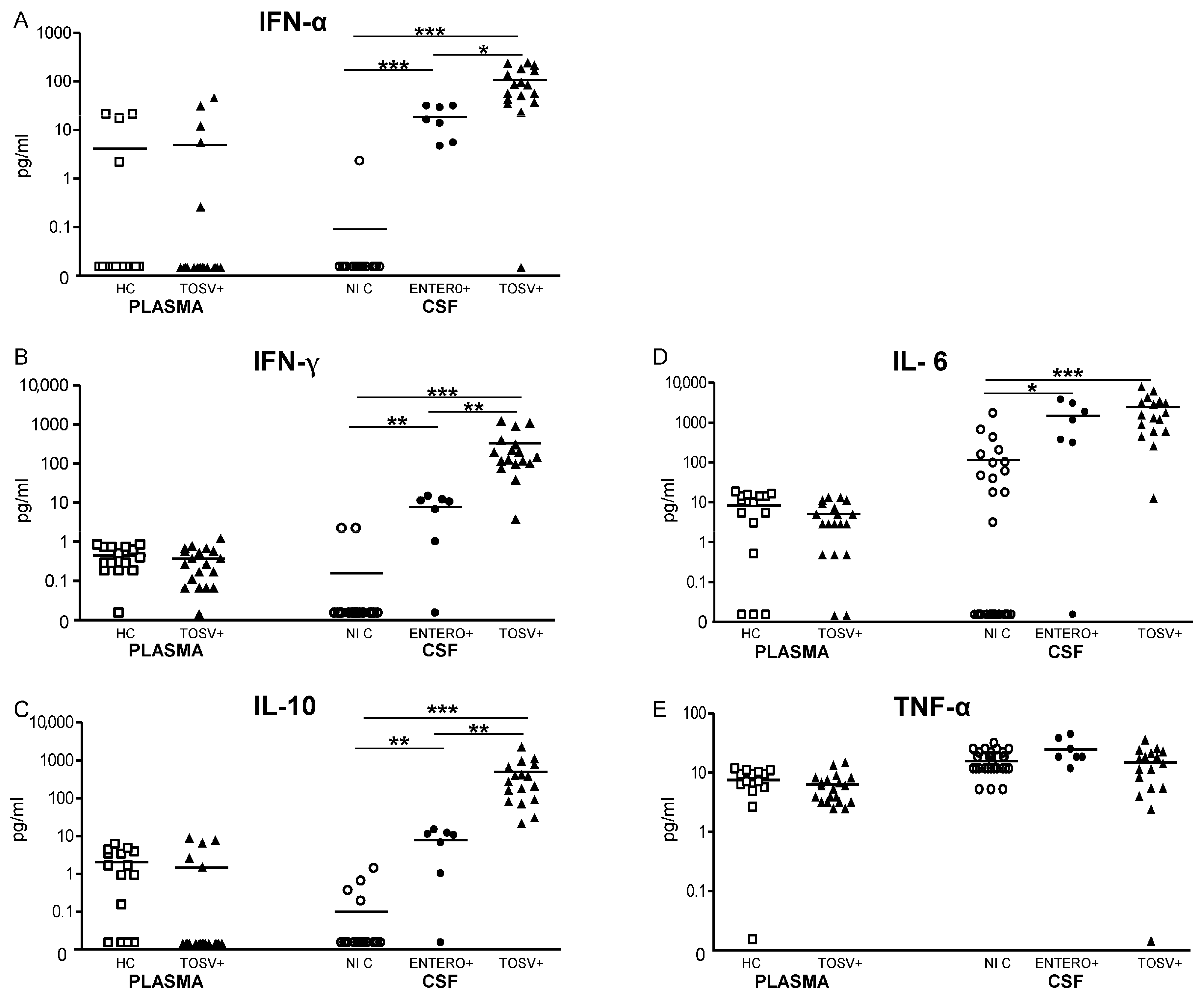 Levels of pro-inflammatory and anti-inflammatory cytokines in plasma and CSF from TOSV-infected patients and controls. The levels of IFN-α, IFN-γ, IL-6, IL-10, and TNF-α (A–E) were measured in the plasma samples from TOSV-infected patients (TOSV+) and from healthy controls (HC) as described in Materials and Methods. Cytokine levels were also measured in the CSF samples from TOSV-infected patients (TOSV+) and from patients with enterovirus meningitis (ENTERO+) and with noninfectious diseases of the CNS (noninfectious controls, NIC). White squares designate healthy controls (n = 15), white circles indicate noninfectious controls (n = 30), black circles designate enterovirus meningitis (n = 7) and black triangles indicate TOSV-infected patients (n = 17, 11 patients with meningitis and six patients with meningoencephalitis). Data were analyzed using the non-parametric Mann–Whitney U test. * indicates p ≤ 0.05, ** indicates p ≤ 0.01 and *** indicates p ≤ 0.001.
