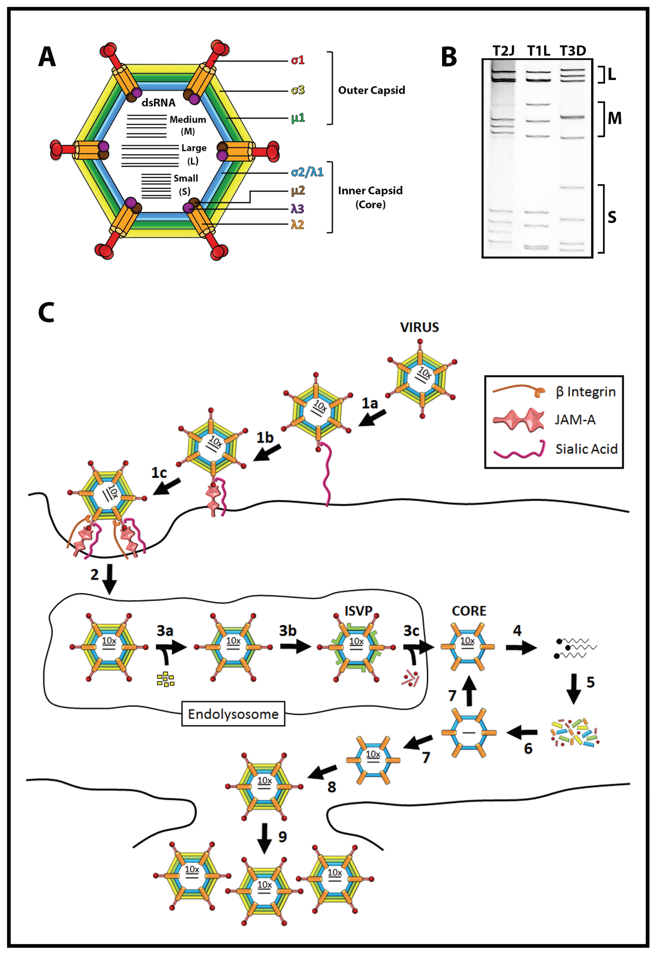 Reovirus structure and replication. (A) Reovirus outer capsid and inner capsid proteins; (B) Genomic dsRNA profiles of prototypic reovirus serotypes 1 Lang, 2 Jones, and 3 Dearing; (C) Life cycle of reovirus. Cell attachment is mediated through (1a) sialic acid binding, (1b) JAM-A association, and (1c) integrin binding; (2) Reovirus is internalized through endocytosis. Within late endosomes/lysosomes; (3) uncoating proceeds through (3a) proteolytic-mediated removal of σ3, (3b) cleavage of µ1 to δ, and (3c) loss of σ1 concomitant with membrane penetration and transition to cores; (4) Viral +sense RNAs are transcribed and released by cytoplasmic core particles; (5) Reovirus proteins are expressed and (6) assemble with +sense RNAs into progeny core particles; (7) Genomic dsRNA is synthesized within progeny cores, which serve to amplify reovirus macromolecular synthesis; (8) Reovirus is fully assembled through addition of outer-capsid proteins and released from cells by lysis and/or apoptosis.