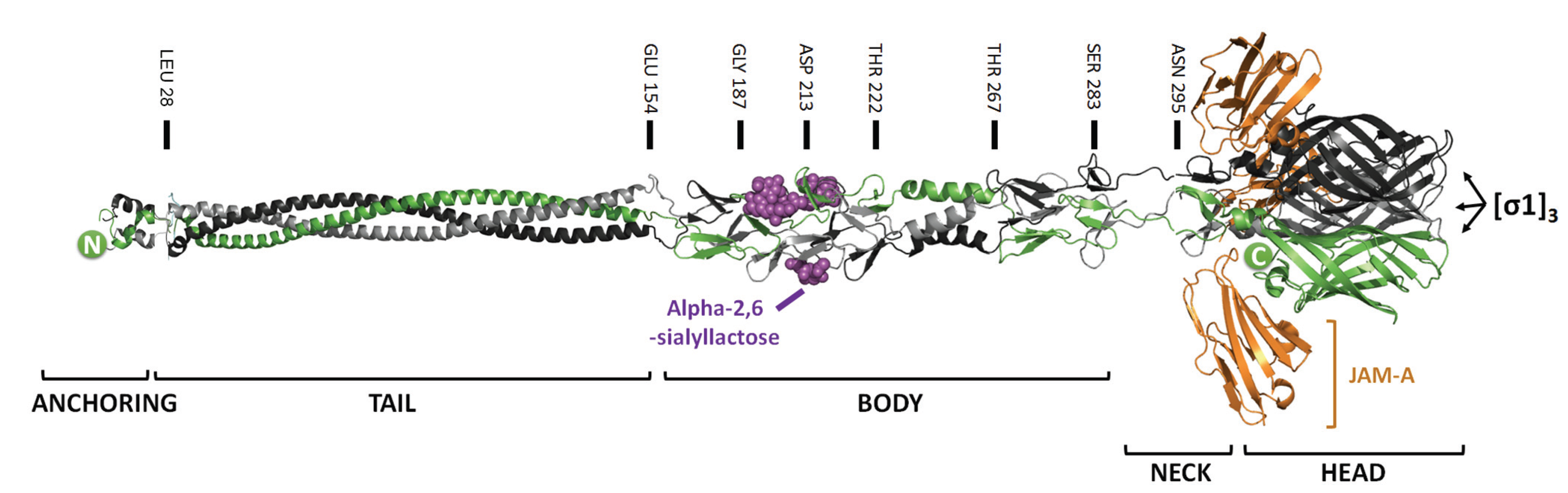 Structure and function of distinct domains in reovirus σ1 trimers. Trimers of σ1, with monomers colored green, grey, and black. Positions of amino acids that define distinct structural domains are provided. Predicted structure of the N-terminal virion-anchoring domain (residues 1–27) and coiled-coil σ1 (residues 27–154) are depicted (coiled-coil crystal structures from the unrelated trimeric autotransporter adhesins, PDB 2YO3, were used for depiction) [52]. The body domain of T3D σ1 (residues 154–283) bound to α-2-6-sialyllactose (purple) and the neck domain (residues 283–295) are depicted from crystal structure PDB 3S6Y [53]. The C-terminal head domain in complex with JAM-A (orange) are from PDB 3E0Y [54]. N- and C-termini are indicated by green circles.