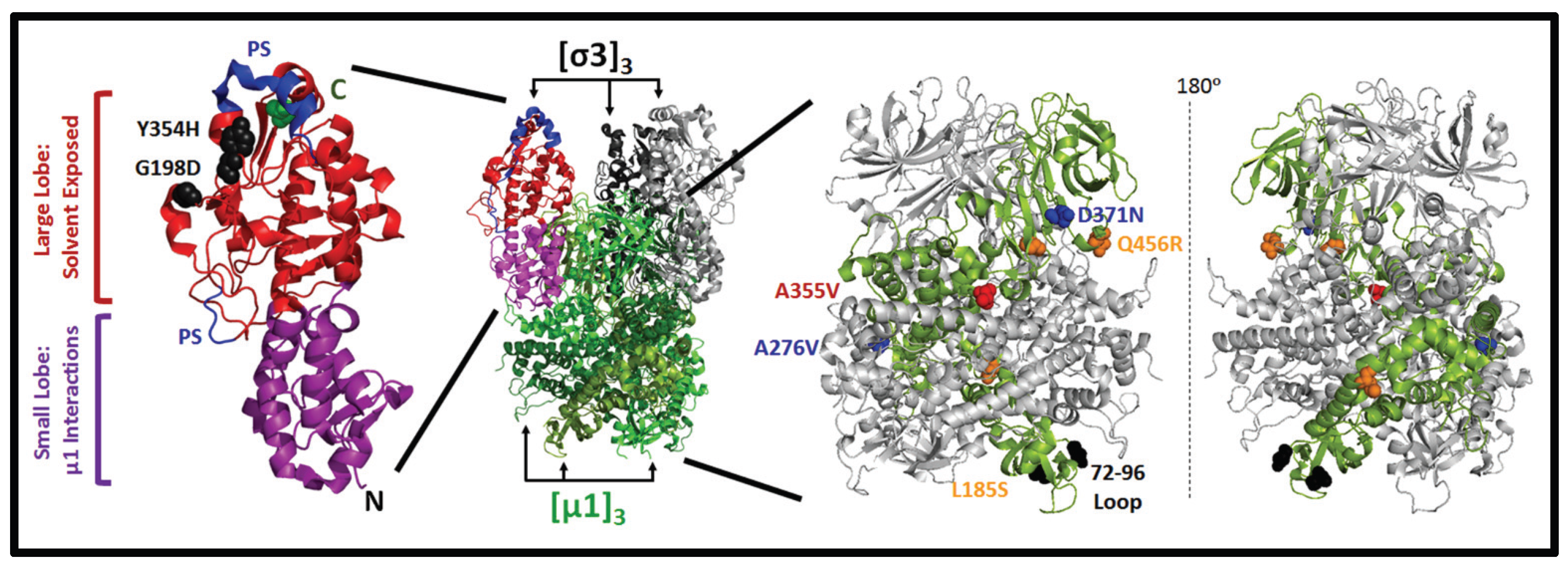 | Y354H | σ3 (Y354H) | C-terminal surface exposed domain | Enhanced disassembly and resistance to E64 protease inhibitor. Enhanced replication, dissemination and pathogenesis in immunocompromised mice | ||