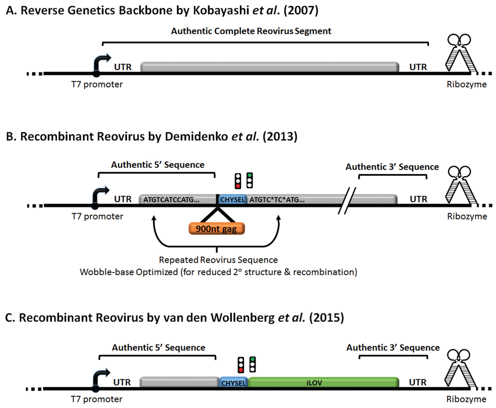 Recombinant reovirus containing exogenous sequences. Illustration of reovirus reverse genetics constructs containing T7 RNA polymerase promoter and ribozyme flanking the 5' and 3' UTR respectively. Reovirus gene segment: (A) unmodified, (B) encoding SIV-gag, or (C) encoding iLOV, were generated as described in the text. In (B) wobble base mutations are denoted by asterisk (*). Constructs were cloned into vector backbone denoted by ellipsis (…).