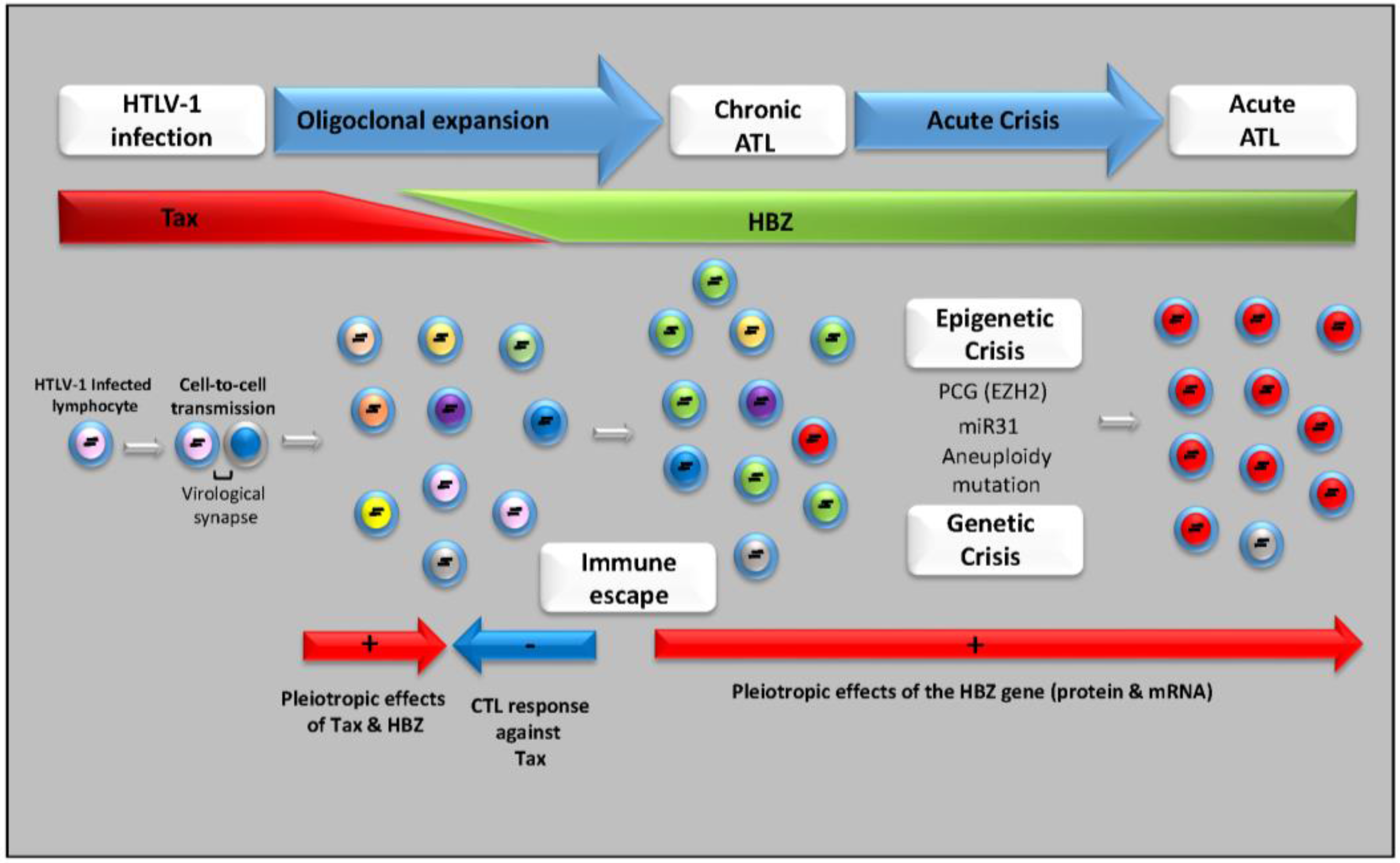 Model for ATL development. HTLV-1 is transmitted in a cell-to-cell fashion via a virological synapse. After infection, HTLV-1 promotes clonal proliferation of infected cells by pleiotropic actions of Tax and other viral proteins. Tax is considered crucial for the oligoclonal maintenance and expansion of HTLV-1-infected cells during the early phase but is only transiently expressed by HTLV-1-infected cells. Proliferation of HTLV-1-infected cells is controlled by cytotoxic T-cells in vivo. Thereafter, continuing expression of HBZ is followed by genetic/epigenetic loss of function of tumor suppressor genes and modulation of micro RNA levels. After a long latent period, ATL develops in about 5% of asymptomatic carriers. Diverse genetic abnormalities are acquired during the progression to ATL from an indolent to an aggressive disease form.