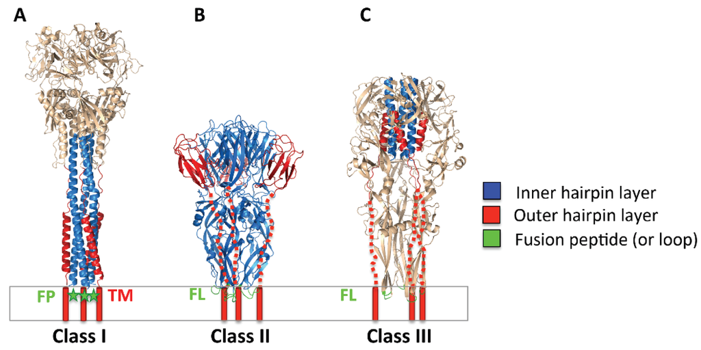 All known viral fusogens belong to one of three different classes (Figure 2) [] although fusogens of pestiviruses and Hepatitis C may belong to a novel class []. Class I is exemplified by Influenza hemagglutinin and includes fusogens from diverse viral families including retroviruses, paramyxoviruses, filoviruses, and coronaviruses, among others. The unifying structural features of class I fusogens are triple-helical prefusion cores, which refold into a six-helix bundle in the postfusion state, and proteolytically generated N-terminal fusion peptides capable of perturbing membranes [] (Figure 2A) (note, however, that Ebola gp uses a loop []). Class II fusogens are found in flaviviruses, e.g., West Nile virus, and have three-domain, beta-sheet-rich structures containing internal fusion loops [] (Figure 2B). They can be arranged as homodimers or heterodimers in prefusion form and are maintained in this metastable condition through association with a chaperone protein [,,]. Class III fusogens possess elements from both class I and II, containing the former group’s helical core and the internal fusion loops of the latter (Figure 2C). Class III includes glycoprotein G from rhabdoviruses, e.g., Vesicular Stomatitis virus (VSV), gB from herpesviruses, and gp64 from baculoviruses of insects []. It is the least well characterized fusogen group, as the structures of both the prefusion and the postfusion forms are known only for VSV G [,] and the refolding pathway has not yet been mapped out.