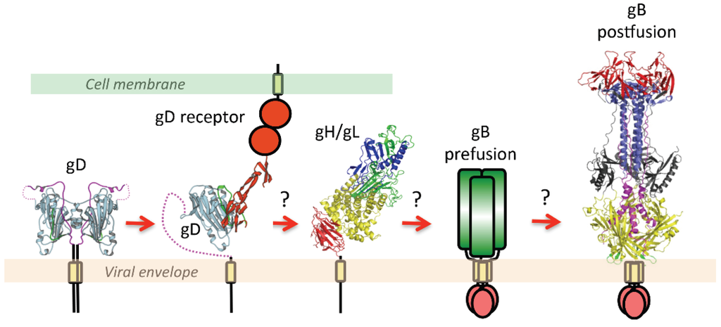 A schematic diagram of essential steps in HSV glycoprotein-mediated fusion. Crystal structures of apo gD (PDB ID 2C36), gD/HVEM complex (PDB ID 1JMA), gH/gL (PDB ID 3M1C), and the postfusion form of gB (PDB ID 2GUM) are shown. The prefusion form of gB has not yet been characterized and is shown schematically. Conformational changes in gD upon receptor binding are well documented. The order of subsequent steps has been proposed but not yet confirmed. Figure was made with Pymol.